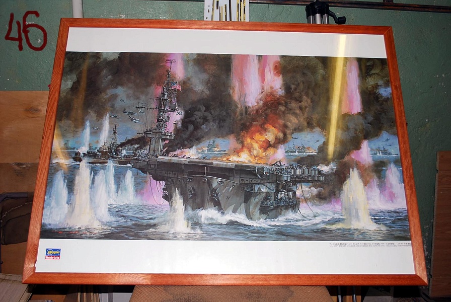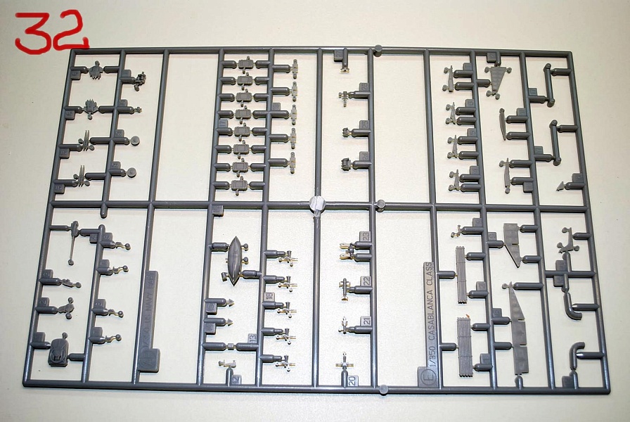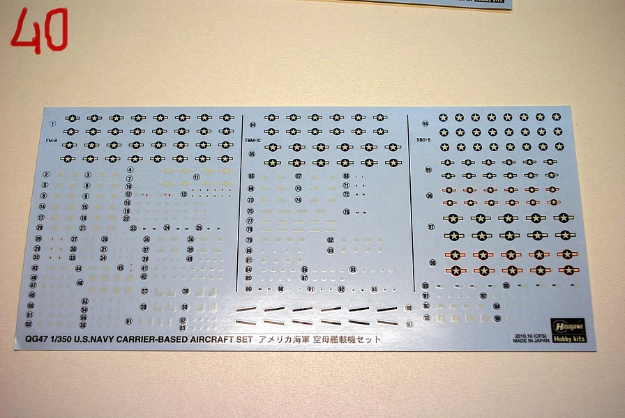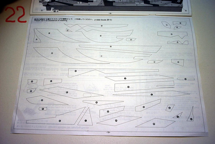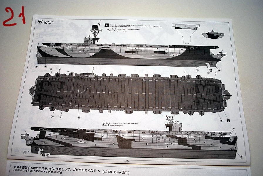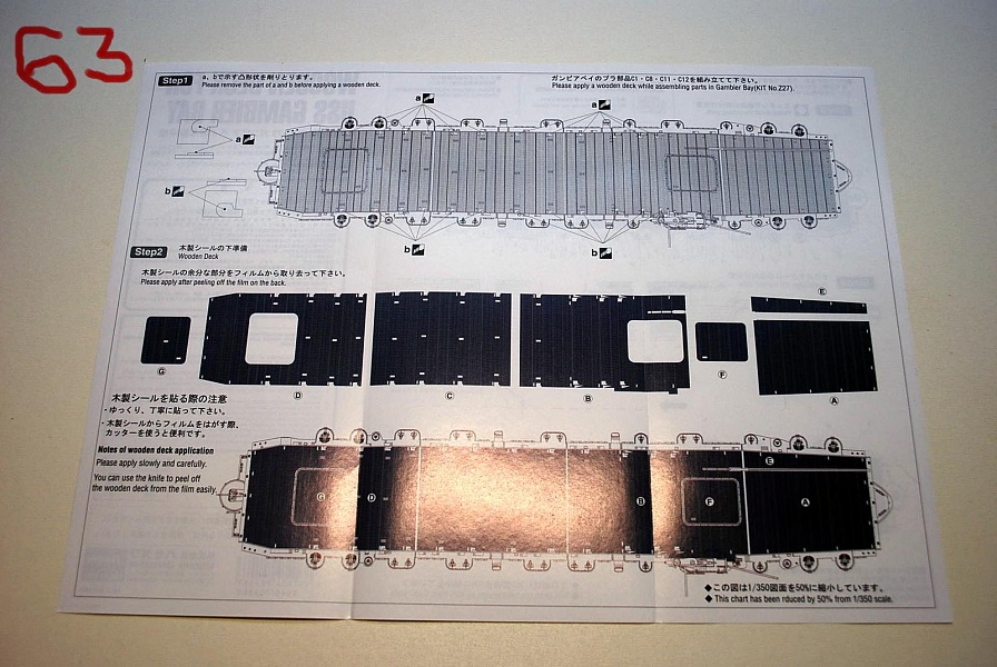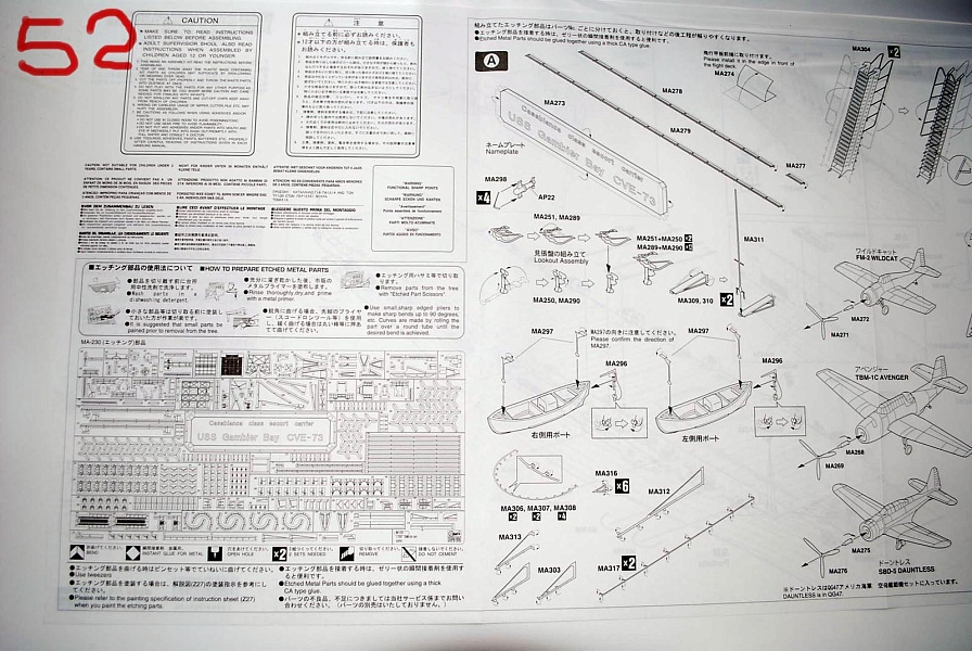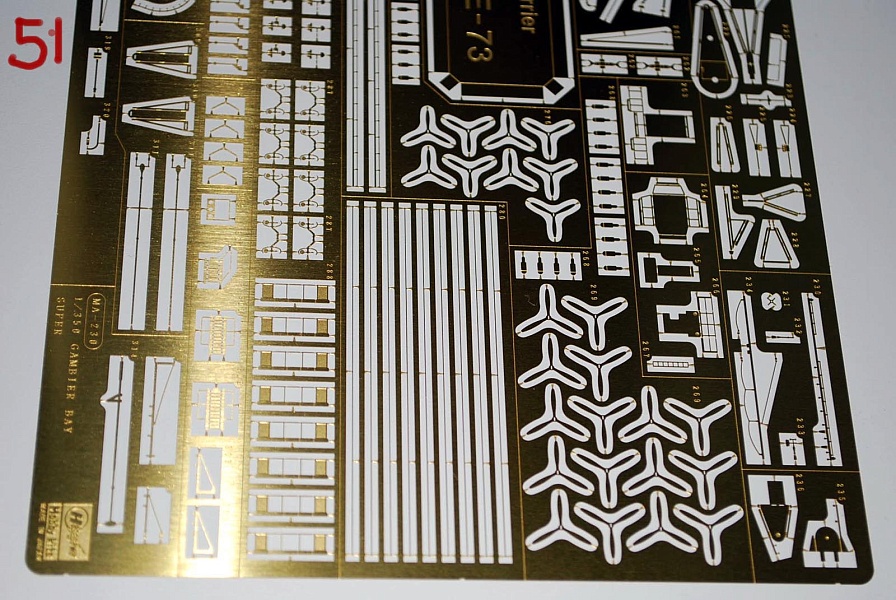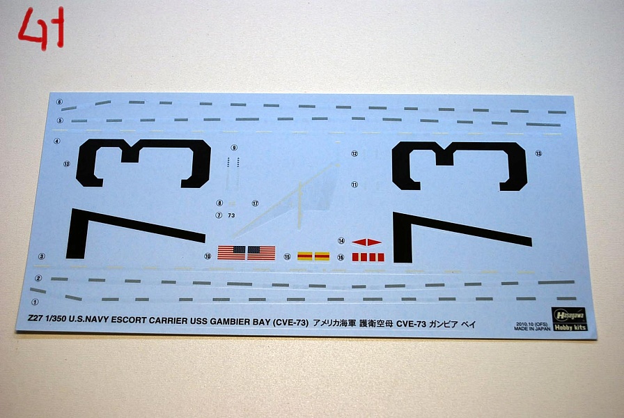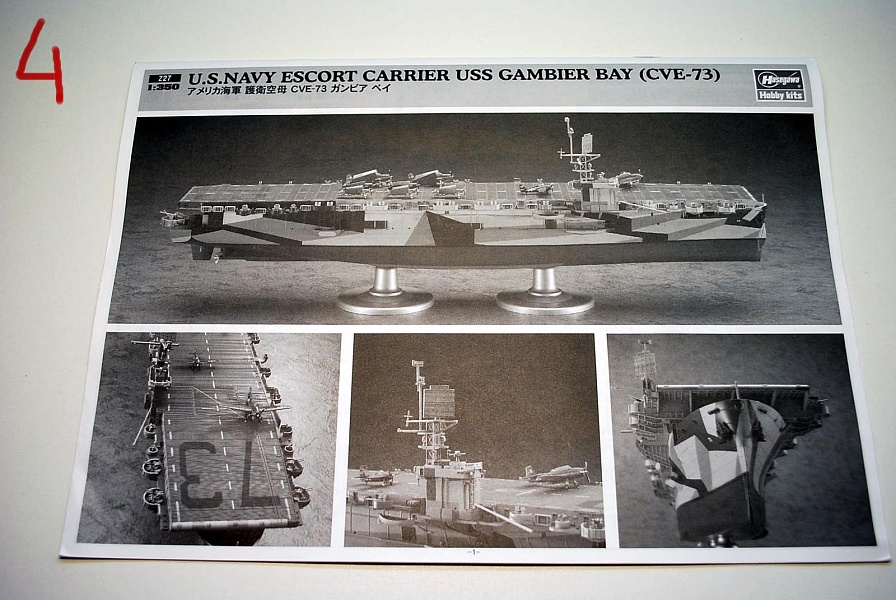 Краткий исторический экскурс. Авианосец Gambier Bay CVE-73 класс «Касабланка» построен в 1943г компанией Kaiser Company, Inc 'S, верфь на реке Колумбия в Ванкувере. Корабль стал 19 авианосцем данного класса по счёту в 1943 г, и первым сверхплановым за что получил прозвище «корабль-бонус». Принимал участие в транспортных и десантных операциях ВМФ США на Тихо-океанском ТВД. Как ни прискорбно, но известность кораблю принесла его гибель. 25 октября 1944 года в составе группы TG77.4 под командованием контр-адмирала Томаса Спрегью, располагаясь у входа в залив Лейте, восточнее острова Самар Gambier Bay оказывал авиаподдержку десанту. В 6:40 утра американские наблюдатели обнаружили приближение крупного соединения вражеских кораблей. Эскортные авианосцы поставив дымовую завесу попытались скрыться от противника одновременно поднимая в воздух ударную группу самолётов. Три эсминца типа «Флетчер» бросились в контратаку. Не смотря на принятые меры тихоходные эскортники попали под арт огонь тяжёлых крейсеров японского флота. Gambier Bay получив несколько попаданий потерял ход, на полетной палубе возник пожар, в 8:50 капитан отдал приказ покинуть обреченный корабль, в 9:11 USS Gambier Bay CVE-73 скрылся в водах залива. Теперь о модели. Коробка (фото 1,2)) очень большая, смогла бы уместить в себя как минимум две таких модели. Модель приехала ко мне из поднебесной, пакетики с литниками летали по просторной коробке, что совсем не пошло им на пользу. Половинки корпуса слетели с литника и изрядно потёрлись друг о друга. В коробке меня ждала маленькая брошюрка на японском и английском языках (фото 3). Инструкция в виде брошюры (фото 4-22), по хасевской традиции весьма подробная, на последней странице лекала масок для нанесения камуфляжа. Пластик светло-серого цвета, литьё аккуратное. Половинки корпуса (фото 23-27) отлиты весьма добротно, стенки достаточно толстые, сварные швы по корпусу сделаны в виде мелкой внешней расшивки. Стыкуемость обещает быть хорошёй. Утяжин и смещения не обнаружено. Примечательно что на маркировке литников написано не USS Gambier Bay а Casablanca class, что наводит на мысль о появлении систер шипов в 350 масштабе. В комплект входят модели трёх эвинджеров и шести уайлдкетов. Самолёты можно сделать как со сложенными крыльями так и готовыми к полёту. Самолёты комплектуются фонарями из прозрачного пластика, также прозрачными сделаны некоторые детали надстройки и прожекторы (фото 39). Декаль представлена на двух листах, непосредственно для корабля (фото 41) и для самолётов (фото40). Подложка показалась слишком толстой, японские производители частенько этим грешат. Фирменная хасевская цепь!))) бывалые корабелы улыбнулись это прочитав, и инструкция к ней на маленьком листике (фото 42,43). Большая схема окраски форматом А2, на обороте схема такелажа (фото 44,45). Большой постер (фото 46)с изображением последнего боя авианосца, он то и виновник слишком большого размера у коробки. Рамка в комплект не входит)). Совсем кратко о «тюненге» предлагаемом производителем. Комплект травлёных деталей «базовы» (фото 47), по сути только леера и некоторые трапы. Комплект травлёных деталей «супер» (фото 48-59), показался весьма полезным, включает мачту, антенны радара и прочую мелочёвку на «остров», трапы, детали для средств ПВО, винты самолётов и много другое. Качество очень порадовало (уже попробовал собрать мачту), в меру мягкое и к