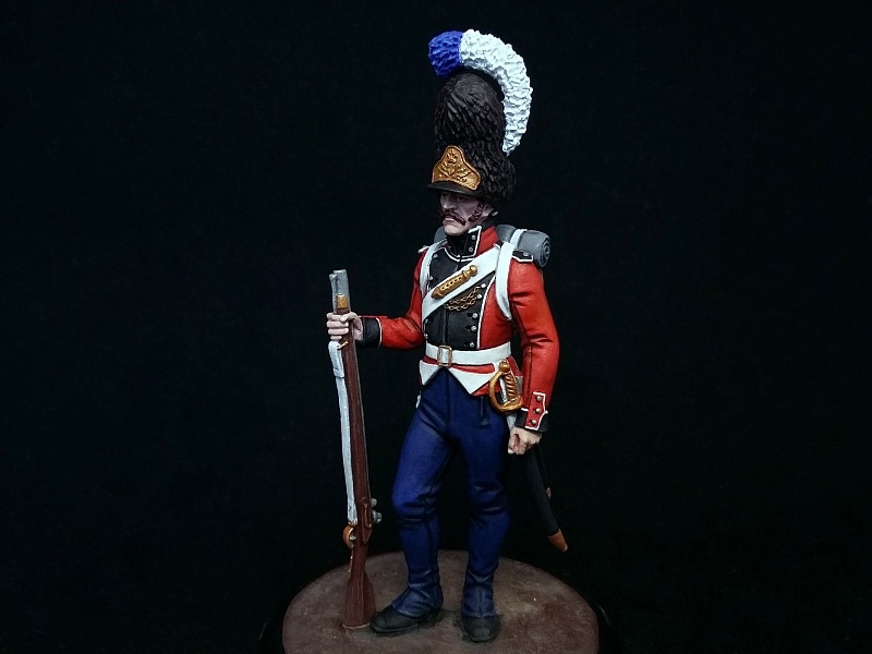 | Здравствуйте! Краски: акрил – Ладога; художественная пастель; подставка из самоотвердевающей пластики FIMO. Металл, 54 мм. Первоначально, датские пехотные полки состояли из двух батальонов. Первой ротой первого батальона была гренадерская рота, а первой ротой второго батальона – рота егерей. Остальные пять рот были мушкетерскими. В 1807 году были добавлены третий и четвертый батальоны, состоящие из солдат различных полков Ландвера. В этих батальонах первыми ротами также были роты егерей. До 1807 года головной убор представлял собой черную круглую шляпу с полями и белой лентой по нижнему краю, белым султаном и черной кокардой. В дальнейшем шляпа была заменена на кивер французского образца. Гренадеры носили черные меховые шапки с козырьком и латунной бляхой. Верх шапки красный с белым галуном и белой кисточкой. Султан белый с синим верхом. Мундир из красного сукна с белыми отворотами пол. Лацканы, обшлага и погоны черные с белой выпушкой. Обшлажные клапана красные с белой выпушкой. Воротник красный с широкой черной вставкой с белой выпушкой и двумя пуговицами. Пуговицы из белого металла. Черная патронная сума с изображением латунной гранаты на крышке, носилась на белой перевязи через левое плечо. Поясная портупея из белой кожи с латунной пряжкой. На портупеи имелись лопасти под саблю и штык, ножны из черной кожи с латунной гарнитурой. Ранец из коровьей шкуры ворсом наружу носился на двух беленых кожаных ремнях на спине. Крышка ранца пристегивалась 2 белеными кожаными ремешками и латунными лужеными пряжками. Сверху к ранцу при помощи двух кожаных беленых ремешков пристегивалась скатка шинели. В теплое время года носились белые панталоны, в холодное – синие. Пехотный полк Гольштейн был сформирован в 1778 году. Спасибо за внимание! |