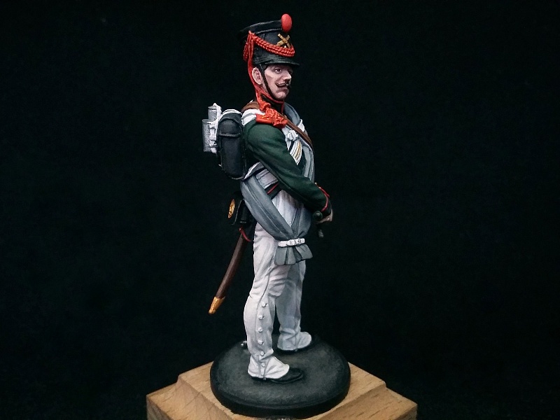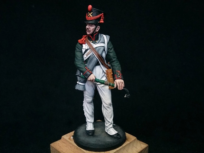 | Здравствуйте! Краски: акрил – Ладога. Металл, 54 мм. Нижние строевые чины армейской пешей артиллерии носили тёмно-зелёные мундиры общего покроя с пехотными. Отличием были воротник, обшлага и отвороты фалд из чёрного сукна с красной выпушкой. Красная окантовка также полагалась на тёмно-зелёных клапанах обшлагов. Погоны красного цвета с выложенным из жёлтого шнурка номером роты и литерой «Б.» (батарейная), «Л.» (лёгкая) или «П.» (понтонная). Панталоны тёмно-зелёные (с 1809 года) без выпушек и с пришивными кожаными крагами на медных пуговицах. Летом носились белые полотняные панталоны общепехотного образца. Кивер имеет установленный с 1808 года герб: два медных скрещенных пушечных ствола с медной же бомбочкой или гренадкой под ними. Этишкет и киверный репеёк – красные. Подбородочный ремешок из чёрной кожи, застёгнутый слева на латунную пуговицу. Амуниция пехотного образца состоит из шинельной скатки и ранца с флягой. Все ремни выбеленные. Лядунка из чёрной кожи с круглой медной бляхой кавалерийского образца. Из вооружения – пехотный тесак образца 1807 года в ножнах из нечернёной кожи. Темляк из белевой тесьмы имеет белую кисть и красный столбик, а гайку и околыш цветами по-ротно: в батарейной роте полевой бригады – белые, в первой лёгкой роте – голубые, во второй лёгкой роте – зелёные. Вторые батарейные роты в составе резервных бригад имели гайку и околыш красные, понтонные роты – чёрные. Канонир пальник держит в правой руке на левую сторону. Отрясание нагоревшего пепла с фитиля постукиванием о левую ладонь. На левом боку висит футляр-ночник. Изначально ночник носился на поясном ремне, но мог носиться и через плечо. Лямка с верёвкой и крюком предназначалась для перемещения орудия по полю силами самого арт. расчёта. Медный и железный протравники на лядуночной перевязи являлись принадлежностью униформы всех бомбардиров и канониров пешей артиллерии. Ими могли пользоваться только по необходимости. Боевой протравник, которым прокалывали картуз в стволе через затравочное отверстие, находился при орудии. Он пристёгивался ремешком к винграду на казённой части орудия. Спасибо за внимание! |