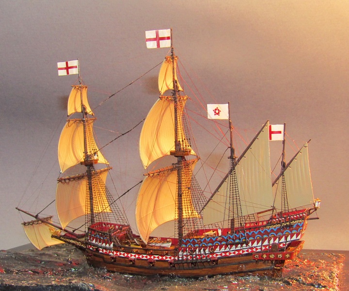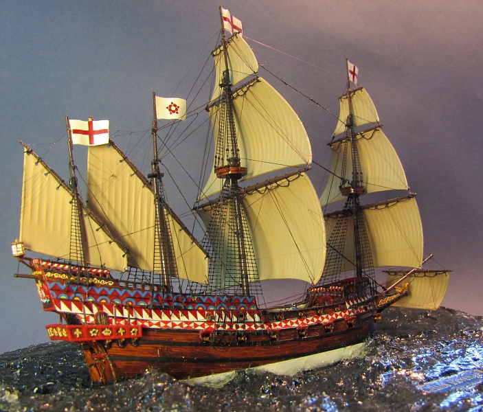 | Когда эта модель только появилась на сайте «Звезды» сразу захотелось себе такую купить, и так получилось что после участия в одной из региональных выставок получил ее в подарок как приз зрительских симпатий. Свою первую модель Revenge от Звезды я уже выкладывал раньше на суд кают-компании Каропки, а сейчас представляю Вашему вниманию мой второй вариант этой модели. После того как в продаже появился набор травления к Revenge от Микродизайна, не смог удержался и сделал еще одну модель корабля. Что получилось судить Вам коллеги. Краткая история Revenge информация взята с англоязычной Википедии, гугл вам в помощь. HMS Revenge английский 46-пушечный галеон, построенный в 1577. Галеон Revenge первый из 13 кораблей Королевского флота носивший это имя. Revenge был построен за 4000 фунтов на королевской Верфи, Deptford в 1577 году Мастер-Корабел Мэтью Бейкер. Его архитектура была началом нового стиля, в судостроении, и совершила революцию в военно-морских боевых действий на ближайшие триста лет. Сравнительно небольшое судно, весом около 400 тонн, была оценена как галеон. Вооружение кораблей этого периода было разнообразным; оружие могло быть добавлено, удалено или изменено, в силу различных причин. Revenge был особенно тяжело вооружен во время ее последнего путешествия. Карьера: Участвовал в рейде на Кадис (1587 г.) который возглавил сэр Фрэнсис Дрейк. В начале 1588, Дрейк перенес свой флаг с Элизабет Bonaventure на Revenge, которая считалась лучшим из новых кораблей. 29 июля 1588 Revenge участвовал в сражении с Непобедимой армадой. В 1589 Revenge снова выходит в море, как флагман Дрейка, в неудачной попытки вторжения англичан на контролируемую испанцами Португалию. В 1590 Revenge командовал Сэр Мартин Фробишер в неудачной экспедиции вдоль берегов Испании, по перехвату испанского флота с американскими сокровища. В 1591 во время рейда по блокированию побережья Испании у берегов Азорских островов Revenge в составе английской эскадры участвовал в бою с испанским флотом, и тяжело поврежденный попал в плен, во время буксировки в качестве трофея в Испанию затонул в шторм у Азорских островов. Водоизмещение: 440т. Длина: 140 футов (43 м) Вооружение:Сорок шесть пушек:20 тяжелых орудий на орудийной палубе26 орудий других калибров Выполненная работа. Переделки и дополнения: Паруса из пластика были покрашены в более традиционный цвет. С парусов были убраны все крепления для сборки без клея, как не соответствующие прототипу. Крепил паруса клеем и нитками. Для такелажа использовались нитки обычные и из бантика. Сделал имитацию обвязки палубных орудий, шлюпки. Вырезал отверстие для руля в корме. Высверлили дула пушек. Кормовой балкон дополнил арками. Что не доделал: модель изначально снабжена только одним якорем, и тот я его забыл повесить, а сейчас и якорь тот где-то потерялся. Не все получилось так как хотелось, некоторые вещи которые получились хорошо на первой модели, на второй повторить не удалось, в большей степени это касается такелажа. Из недостатков в окраске: залил краской из баллончика травленные юферсы. Тонировать паруса не стал сознательно, так как не люблю марать модель грязью. В работе использовал фототравление «Микродизайн» для Revenge в 1/350. По фототравлению могу от себя сказать: 1. Очень понравились ванты, ажурные юферсы. Но нужно быть аккуратным легко можно зацепить и погнуть так что потом и не выправишь. Особо осторо