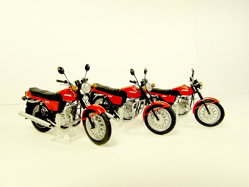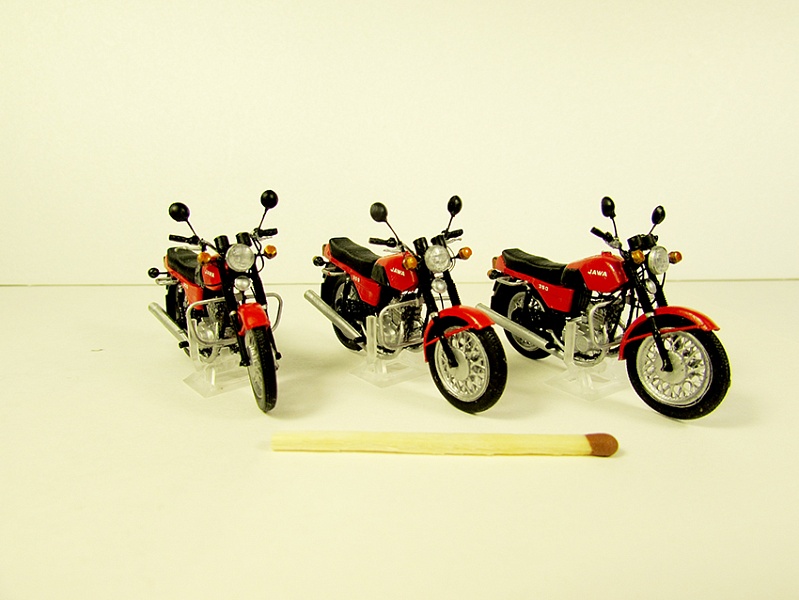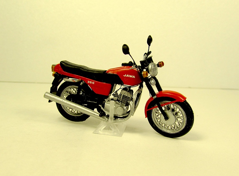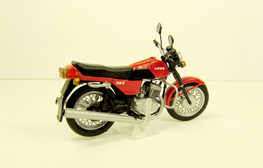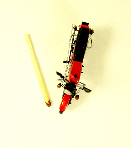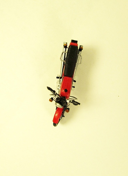 | Мотоцикл в автомобильном масштабе. Набор состоит из 24 деталей. Одна из них- прозрачная, три (покрышки и сиденье)- из материала похожего на резину.Колёса со спицами- 3Де принтер. На мотоцикле 6 декалей. Из резиновых нитей спандекса (в 2-3 раза толще человеческого волоса) сделаны тормозные пасики и переключатели скоростей, управление газом, показан бензопроводная трубка от бака к карбюратору. Даётся одна деталь- подставка- такую кроху хорошо рассматривать в вертикальном положении. Колёса - крутятся. Вилка рулевая- поворачивается. Хороший подарок коллекционеру. |