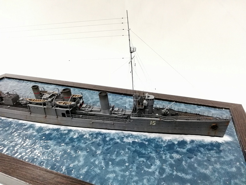УРА первому "сдавшему флоту" этот эсминец!!! Орудиям придан угол возвышения - зачёт, я тоже стволы смонтировал так чтоб в диаметральной плоскости орудия не упирались друг в друга. Из минусов - отсутствует название на борту и плавсредства напрочь без вооружения и без обвязки - а жаль, ведь такелаж явно получился! Ватерлиния белая очень украсила бы модель. Параван-балки на месте, а параванов что-то не видно. И вот не надо экономить время на высверливании дымовых труб - труба как бетонная колонна не радует. Ещё - кажется, на трубах были ванты. Но всё равно от меня "белый шар" и за Галерею!