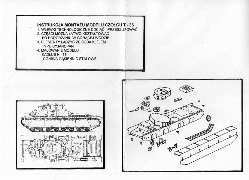 Смоляная модель известного советского танка. В магазине маркировалась как Mkt-7205 - Soviet T-35 Multiturret Medium Tank (1/72) Небольшая, но толстая коробка из твёрдого картона, в которой завёрнуты в "пупырчатый" полиэтилен пакетики с деталями. Деталей достаточно много, на вид неплохо проработаны, смола режется и шлифуется легко, раковин вроде нет. Инструкция... Если это конечно можно так назвать... Отксеренный листик с абсолютно не информативными схемами. Схем окрасок нет. Декалей нет. Если честно, даже страшновато браться на модель, никогда полностью смоляную не делал, а тут ещё и не самая простая. Но другую в 72 маштабе не нашёл, и, вроде, её не существует в природе. Стоила около $30 USD  |