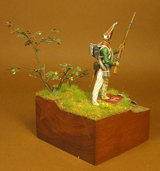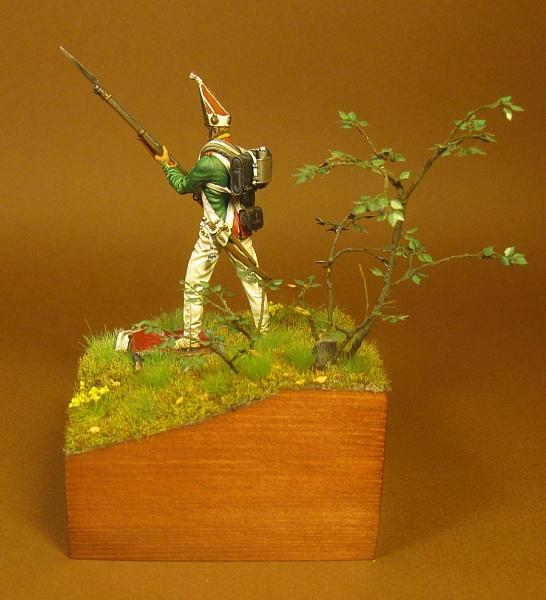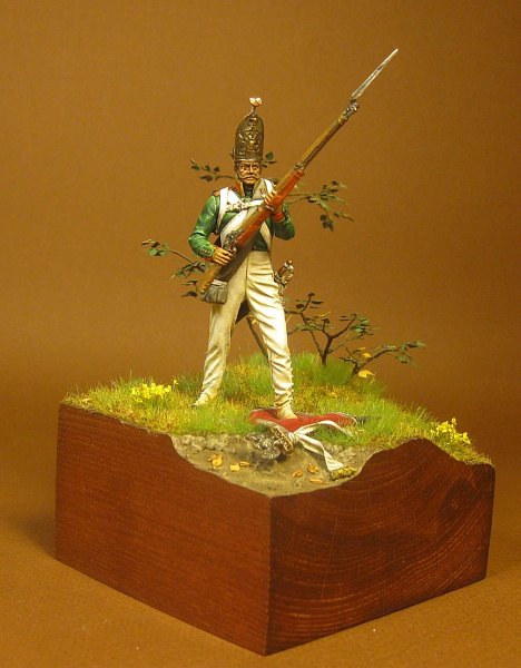 | Фигурка Унтер-офицер Павловского гренадерского полка от chronos-miniatures 54мм. Металл. Красил акрилом «Ладога». Эту фигурку приобрёл пару лет назад, долго не мог к ней приступить. В отличии от фигурок из смолы от хроноса, эта фигурка из металла оказалась очень низкого качества - непонятные наплывы и трещины, плохая стыкуемость, в общем беда. Остаётся надеяться что сейчас качество работы с металлом у хроноса повыше. Эту фигурку делал одновременно с рыцарем, поэтому выставляю одновременно. Павловский гренадерский полк. Павловский гренадерский полк был сформирован 19 ноября 1796 г. из двух батальонов Московского гренадерского полка. Полк принимал участие в экспедиции в Голландию (1799 г.), походе в Ганновер (1805 г.). В русско-прусско-французской войне 1806-1807 гг. сражался под Чарновым, Пултуском, Прейсиш-Эйлау, Линденау, Гейльсбергом, Фридландом) В сражении под Чарновым 11 декабря 1806 г. полк отличился при отражении второй атаки французов. Неприятелю удалось занять высоту на левом фланге русской позиции и овладеть лёгкой батареей. Отбивать высоту были посланы павловцы. Батальон майора Палибина бросился с фронта, а подполковника Лохова – с фланга. Оба батальона ударили в штыки и после рукопашной схватки сбросили французов в реку Вкра. Во время третьей атаки капитан Тарновский стремительно ударил со своей ротой во фланг французской колонны, отбросил её назад, но при этом был ранен пулей в живот. При отражении четвёртой атаки павловцы вновь бросились в штыки и опрокинули неприятеля в болото перед берегом реки. В ходе боя полк потерял 232 человека убитыми и ранеными. Шеф полка генерал-майор Мазовской, майор Палибин и подполковник Лохов были награждены орденами Георгия 4-го класса. В сражении под Прейсиш-Эйлау Павловский гренадерский полк участвовал в разгроме корпуса Ожеро. Батальон майора Махова и 2 роты во главе с капитаном Пановым ударили во фланг французам. Для спасения войск Ожеро Наполеон бросил конницу Мюрата. Своим правым флангом всадники Мюрата налетели на павловцев. Поручики Акутин и Баланичев составили каре и отбили атаку. Отступающую кавалерию французов полк провожал батальным огнём. Фельдфебели Федосов и Корольков, унтер-офицеры Суслов, Изосимов и Портнов, рядовые Кононов и Тюхменев захватили в плен спешенных французских латников. Затем полк участвовал в отражении атак дивизий Морана, Сент-Иллера и Гюдена. По сообщению Беннигсена, во время одной из атак французов их колонна обратилась назад только от одного вида павловских гренадер, «которые с отменной храбростью на поле сражения одобряли геройственным своим видом друг друга, через что только равнодушным фронтом поразили сильно стремившуюся на них неприятельскую колонну». В начале 1812 г. полк состоял во 2-й бригаде Первой гренадерской дивизии и пополнялся лучшими людьми из полков 11-й и 23-й пехотных дивизий. Шефом полка с 9 ноября 1807 г. по 21 октября 1813 г. был генерал-майор (с 31 октября 1812 г. генерал-лейтенант) Д. П. Неверовский, командиром в 1812-1813 гг. – полковник Е. Х. Рихтер. 6 декабря 1813 г. шефом полка стал генерал-майор П. С. Макаров. В начале кампании 1812 г. действующие батальоны полка были в своей дивизии в составе 3-го пехотного корпуса генерала Н. А. Тучкова 1-й Западной армии. Запасной батальон был направлен на формирование 32-й пехотной дивизии. В составе отряда генерала А. Ю. Гамена он принима