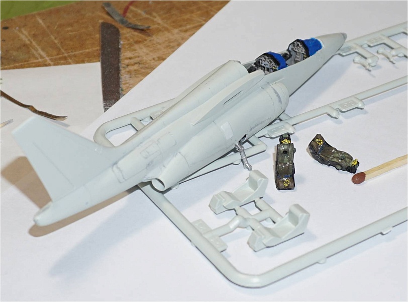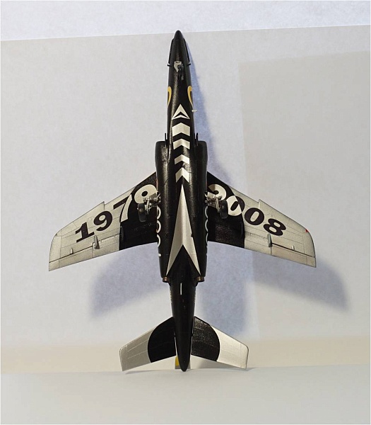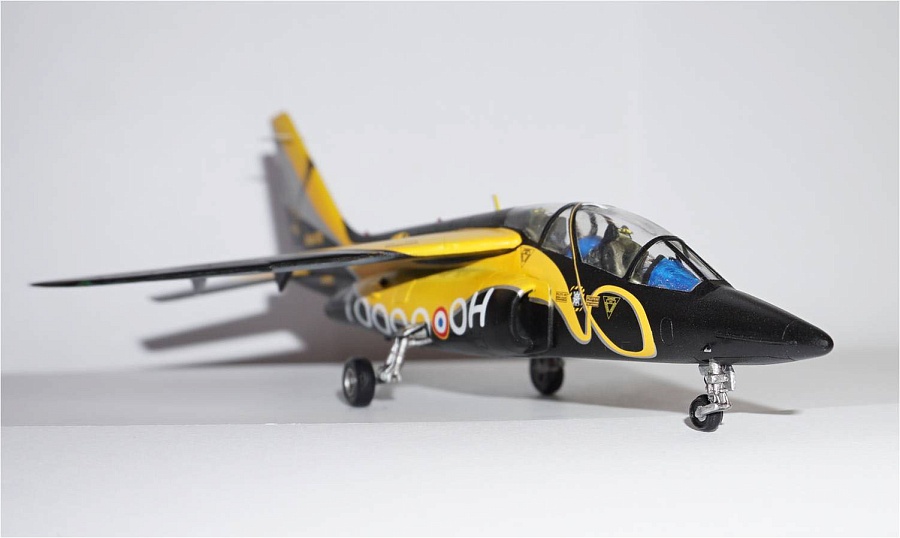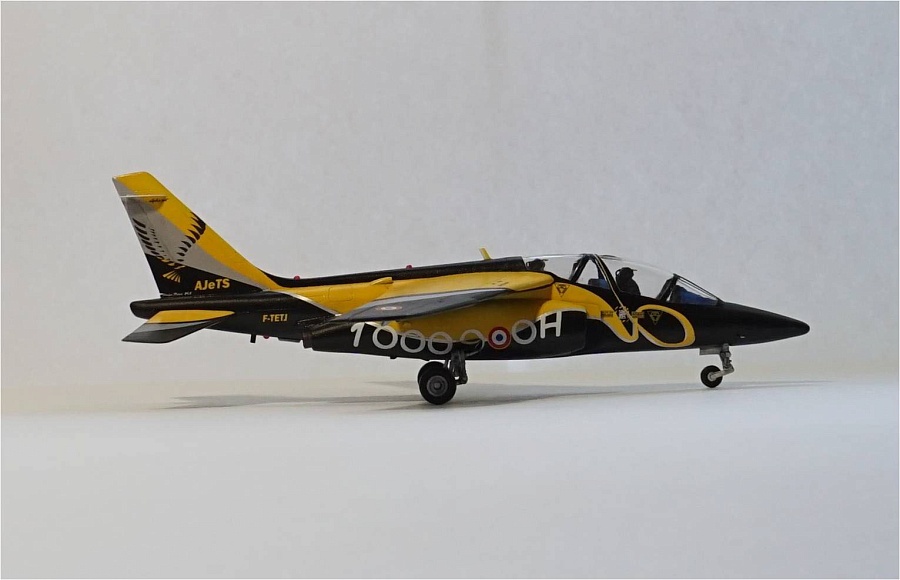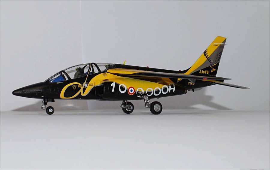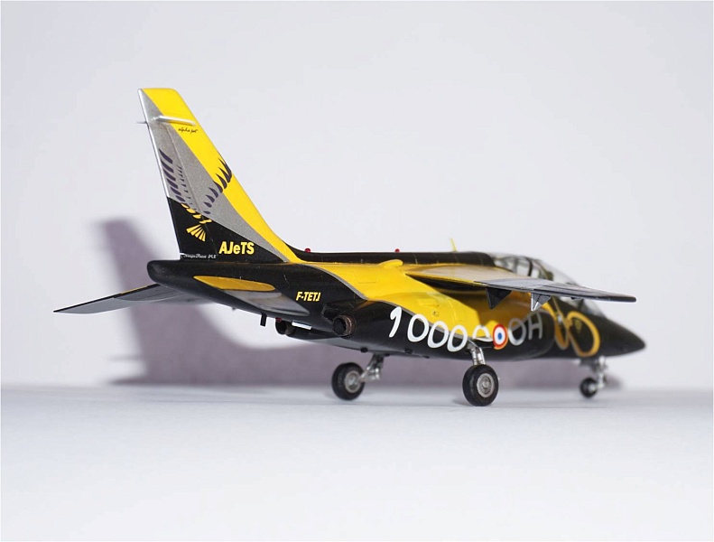Закончил свой очередной проект. Alpha jet - E, юбилейный французский борт, который за период с 1979 по 2008 гг. налетал 1 миллион часов. (что и отраженно на его борту). Этот учебно-тренировочный самолёт/лёгкий штурмовик, будучи созданный ещё в 70-е гг. задал моду и концепцию компактного учебного самолёта и лёгкого штурмовика на долгие годы вперёд.Модель от Ревела привлекла своей интересной окраской, однако в коробке лежит, видимо очень древний пластик с внешней расшивкой, сильным упрощением некоторых элементов и, (как оказалось в процессе сборки) кучей нестыковок. Что касается остекления, то оно, как мне показалось, имело трещину вдоль всего колпака заднего пилота. Для сборки я докупил смоляные сопла и воздухозаборники двигателей, а также кабину, где в наборе было и остекление, что очень обрадовало…. поначалу…. примерка показала, что кабина сделана для Эллеровского пластика, она оказался значительно уже в передней части и немного выше чем нужно. Что касается фонаря, то он оказался короче и ниже чем требуется. В отчаянии я попробовал шлифануть родной фонарь и О ЧУДО!!! то что похоже на трещину - оказался, видимо, следом от пресс-формы (на ощупь совершенно гладкий), но ЕГО МОЖНО БЫЛО СОШЛИФОВАТЬ. Собственно этот момент и стал стимулом к сборке модели. Смоляной кокпит пришлось кардинально доработать, но всё же он смотрится намного лучше, чем родной, который сильно упрощён. Стыковка некоторых деталей вызвала затруднения, давно я не использовал столько шпаклёвки и пластиковых вставок (для сборки пластика ЛВД). А местами пришлось заделывать ещё и дыры, в местах где я прошкурил фюзеляж насквозь. Полагаю, что сказывается старость пресс-форм. Например основные стойки шасси - имеют разную высоту и разный угол наклона шпиньков, на которые крепятся колёса. Разница практически не заметна на глаз, наверное, чуть меньше миллиметра, но в такой сборке разница высот кончиков крыльев достигает уже 3-4мм, и визуально - заметна. Для того чтобы приклеить фонарь кабины пришлось нарастить высоту бортов по всему периметру кабины, причём в некоторых местах более чем на 1 мм. Антенны из набора (за кабиной и на киле) лучше оставить на литниках и сделать новые. Также на модели добавлены самодельные: носовые гребни, ПВД, антенна слева под кабиной первого пилота, и несколько хвостовых антенн, а также навигационные огни (эльф), пара накладных лючков в верхних частях мотогондол под крыльями. Несколько мелких антенн спереди и снизу под двигателями я делать не стал, из риска их сломать. На стойки шасси добавлена проводка электрожгутов и посадочные фары, а также гидролиния к дисковым тормозам. Сопла двигателей и воздухозаборники на мотогондолах - смоляные от павлы. Входные сопла воздухозаборников двигателей - оставил родные, т.к. шпаклевать надо было много в обоих случаях, я опасался, что на смоле шпаклёвка будет держаться хуже. Много "радости" доставили крылья. Я думал их подогнать "на сухую" и окончательно приклеить после окраски. Однако на деле всё оказалось не так просто. Щели и углы установки не оставляли никаких шансов для реализации первоначальной идеи. Внешняя расшивка полностью перерезана на внутреннюю, добавлены разнообразные лючки, тормозные щитки, местами клёпка. Посадочные фары в крыльях зашпаклёваны, видимо это рудимент от другой версии джета. Покраска. Окрашено всё кра