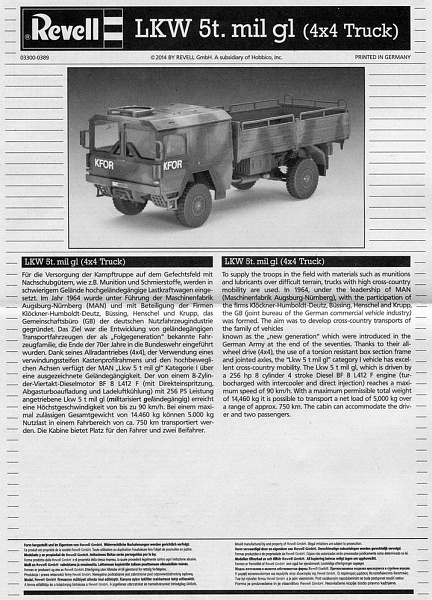 | Привет Всем!!!! Привезли мне тут из Москвы новинку Ревелльную - МАН 4х4 в 1/72....К ранее представленным 6х6 и 8х8.... О матчасти: Сначала подумал, что это новая машина, оказалось нет....просто к 2хосным машинам немцы пришли давно.....это мы после Дакара пришли к КАМАЗУ Мустангу и Уралу 2хосному(не могу привыкнуть - уродливо выглядит... Не знаю почему пр-ль не назвал марку машины а назвал ее 5 тонным военным грузовиком. Машина МАN N4510 5 тонн,выпуска 1976 - 1982(3001 шт., в Бундесвере обозначается модель 451) и с 1985 на экспорт.... Для ориентировки МАN N4520 и 4620 - машина 6х6, 7 тонн....в серии с 1977г. МАN N4540 и 4640 - машина 8х8, 10 тонн....в серии с 1976г. Все вышеперечисленные машины представлены в линейке Ревелла.....теперь можно собрать ВСЕ немецкие "КАМАЗЫ".... О модели: В достаточно большой коробке(больше других) черного стандартного дизайна пакет с 4мя платами, инструкция брошюрой и декаль с полоской прозрачного пластика. Темно зеленый пластик, традиционно богато детализированная рама с подвеской. опять же колеса со слабеньким протектором. Достоинства - Ревелл он и в Африке....в сборке покажет... Недостатки - отсутствие стекол, дворники отлиты с кабиной - для любителей можно срезать и сделать, правда параллельные кулисы делает это....сексуальным процессом....Решетки для фар грубоваты..... В остальных моделях МАN ВСЕ точно также.... Если кто желает, статейку про линейку машин могу повесить позже.... |