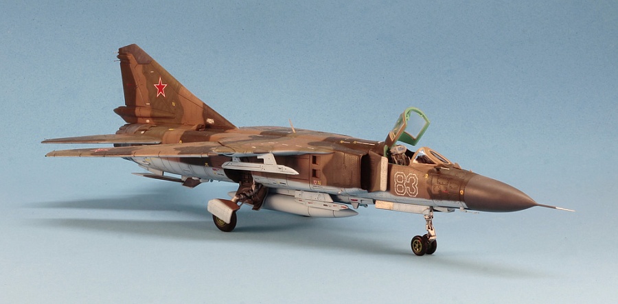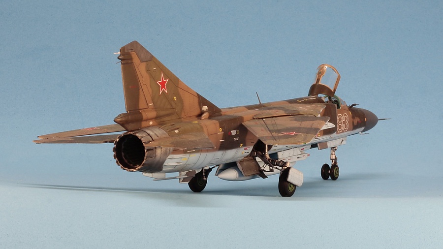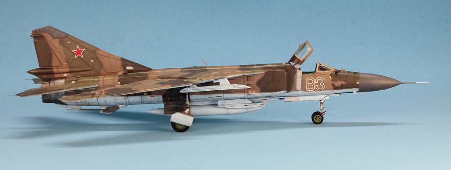 | Приветствую!Представляю Вашему вниманию модель,собранную пару лет назад для турнира на Scalemodels,многие возможно уже видели её.Сам пластик тоже многим знаком ,несмотря на множество ошибок и неточностей в общей геометрии и деталях ,модель RV всё таки пока является лучшей в 72-м масштабе .В работе использовал смоляную кабину и ниши шасси Res-im,ПВД Master ,колёса Экипаж.Переделал переднюю стойку шасси,в наборе она для 23М,на "лёгких"версиях добавлен двузвенник вместо гидроцилиндра,в нижней части фюзеляжа сделал створки ВСУ ,при выпущенном шасси они должны быть открыты,изменил угол установки основных опор шасси,может сделал неправильно с точки зрения матчасти,но верно "идеологически",на МЛ-МЛД-П фюзеляж располагается практически горизонтально ,нет характерного проседания на хвост ,как у 23М.Модель конечно не для новичков и слабонервных,подгонки-шпаклёвки-шкурения было предостаточно.К моему великому сожалению подвижные части крыла при максимальном угле стреловидности распёрли НЧК ,что сильно заметно,я это увидел уже на финальном этапе,на следующих моделях если делать в подобной конфигурации ,то нужно будет или консоли стачивать по толщине(те места,что уходят в НЧК)или НЧК выбирать изнутри.Красил АКАНом 6ХХХ серии ,от руки,без масок ,только отбил верх-низ Blue tak.На первый взгляд ничем не примечательная машина из 472 ИАП ПВО ,но для меня очень знаковая .Деревня бабушки,в Курской области(да я и сам там родился) находится в 30 км от аэродрома Халино ,где базировался полк и на протяжении всех 80-х годов,каждое лето,почти каждый день наблюдал полёты этих красивых машин. |