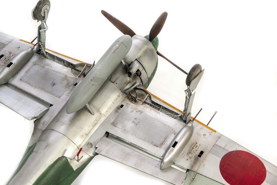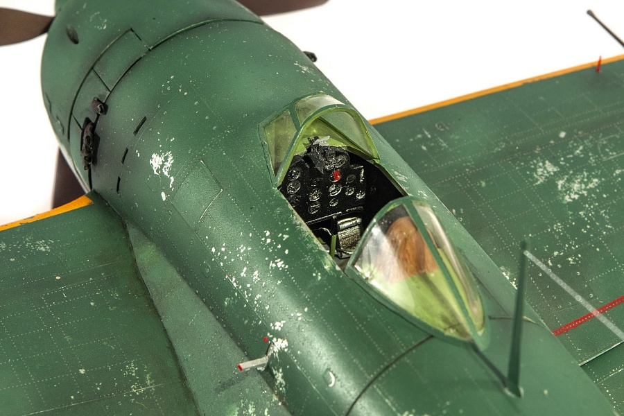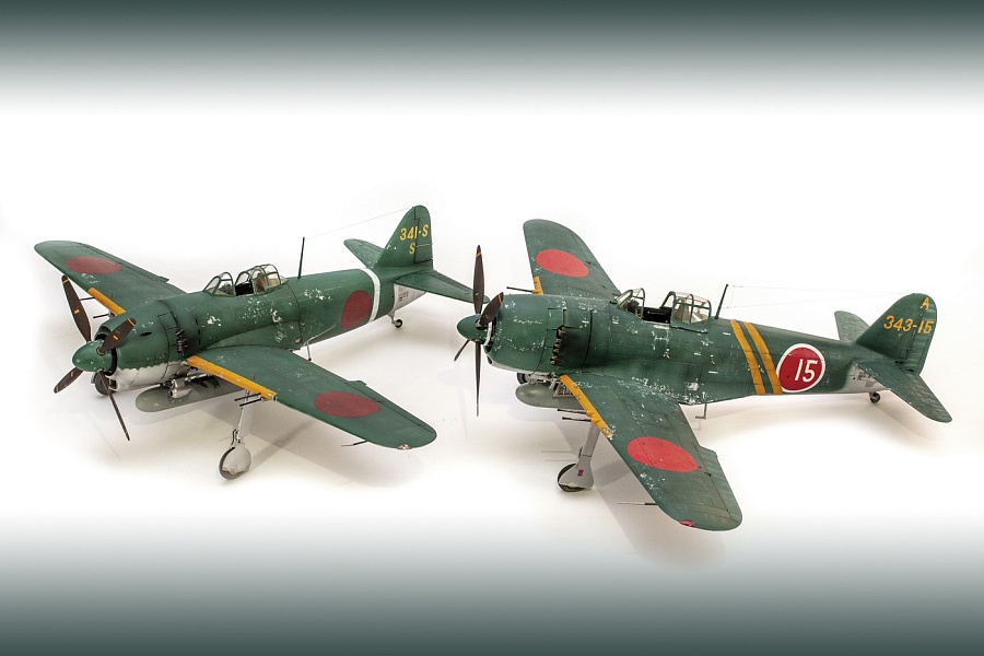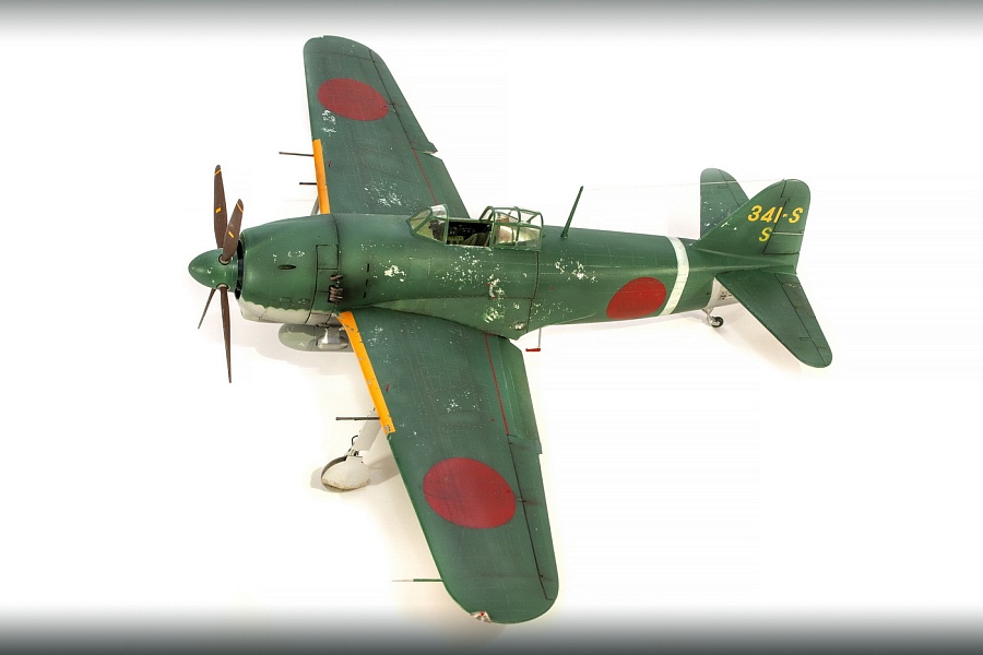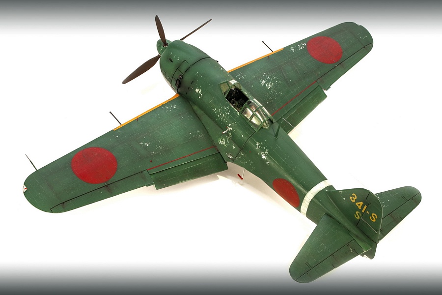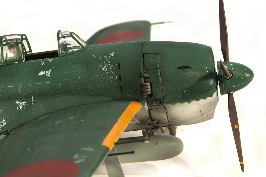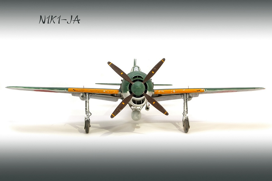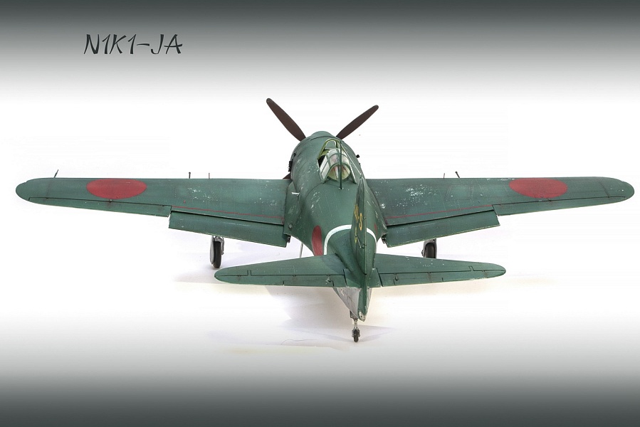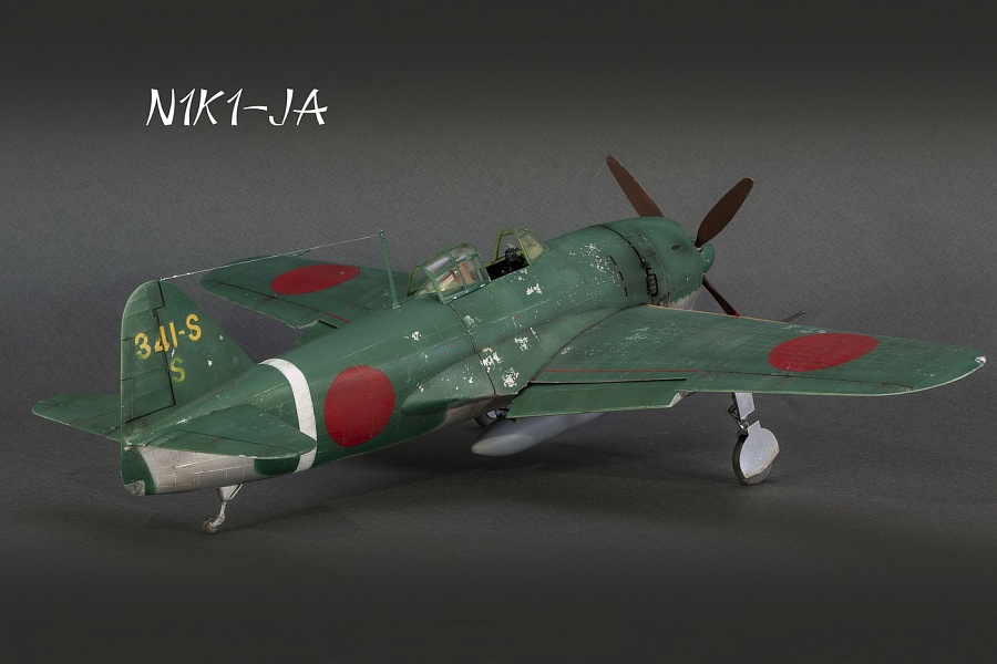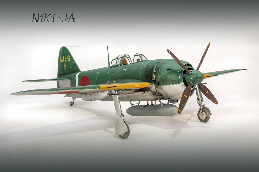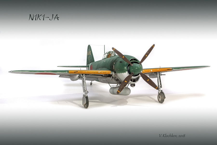 | Добрый день, уважаемые моделисты. Сегодня я хочу показать и рассказать о постройке модели самолёта Kawanishi N1K1-Ja фирмы Revell в 32м масштабе. Модель эта очень старая, выпуска 70х годов прошлого столетия. И очень редкая в данный момент. Это первая модификация самолёта на шасси, переделка из поплавкового варианта. Её плюсы — данную модификацию в 32м масштабе никто в мире не делает, и вроде не делал). Модель достаточно правильная по геометрии. Так что для любителей японской авиации просто конфетка. Но есть и большой минус — модель очень простая, даже ОЧЕНЬ. Нет практически никакой деталировки кабины, ниш шасси и так далее.. Если крупные детали — фюзеляж, крыло, отлиты весьма неплохо,то вся мелочёвка грубая, с большим облоем. Но это уже проблемы моделиста. Модель я эту делал на заказ и просьба была сделать её просто из коробки. Тут я понимаю заказчика — на модели очень мелкая правдоподобная наружная клёпка, правда и расшива наружная — увы, и хотелось сохранить дух модели того времени. Но не делать ничего — так я не умею. Кое-что доработал в процессе изготовления. И вся проблема в работе с этой моделью даже не эта — на самолёт практически нет информации.. Кабина только рисунки и пару никаких фото, по шасси тоже проблемы. Окраски все однотипные. Хотя фото есть времён войны, но и они оставляют желать лучшего. Начал я с двигателя. Сделан он достаточно копийно, но просто и замылен. Правда его и не будет видно практически, даже если захотеть и заглянуть во внутрь капота. Всё аккуратно покрасил, добавил пару трубок, провода свечей. Внутренние всасывающие патрубки сделаны неплохо, хоть они и остаются внутри, а вот наружные выхлопные никакие. Надо доделывать. После двигателя настала очередь кабины. Кабина очень простая 0 грубое кресло и 2 ящика сбоку. Поэтому я решил практически всё ( кроме приборной доски) сделать заново. Кресло спаял из меди, ремни у меня комбинированные — что-то из остатков, что-то самодельное. Вроде получилось. После этого взялся за крылья и ниши. На криле я решил выпустить посадочные щитки. Вроде они идут в модели, но вот крыло под это не сделано. Нужно самому резать и переделывать. Ниш шасси на модели нет вообще. Просто пустая дырка. Пришлось что-то делать по немногим фото. Стойки тоже доделывал. Колёса «подспустил» нагретым паяльником. Небольшие трудности возникли при стыковке частей модели. Первое — сходимость не на лучшем уровне, второе — не хотелось бы портить наружные элементы модели. Поэтому я заклеивал скотчеи всё вокруг швов, оставляя 2-3 мм. Зачищал, и потом накатывал клёпку и расшиву прорезал. Ревитер пластик немного приподнял, тут всё нормально, а для восстановления расшивки я взял сделал резак с кромкой вроде как у колуна. Вроде получилось. Выше я писал, что окраски самолёта все однообразные. Просто верх сине-зелёный, низ серебристый или светло серый. НО я случайно нашёл фото самолёта с белой полосой возле киля. Хоть какое-то «украшение». И декали кодов и цифр с переделкой и доделкой можно использовать из набора. Про декали — конечно, всё ,что можно дул через трафарет( у японцев это весьма несложно), но и перевёл немного. Думал что за столько лет всё негодное. Инструкция жёлтая, подложка на декалях жёлтая, но вот перевелись очень хорошо .Легко привариваются. Краски все мешал сам. Для палитры использовал краски АКАН, литературу и инфор