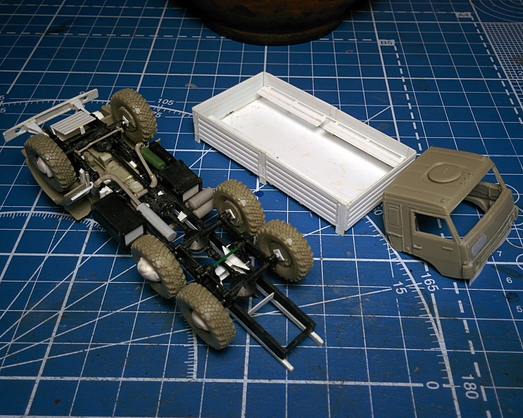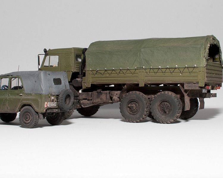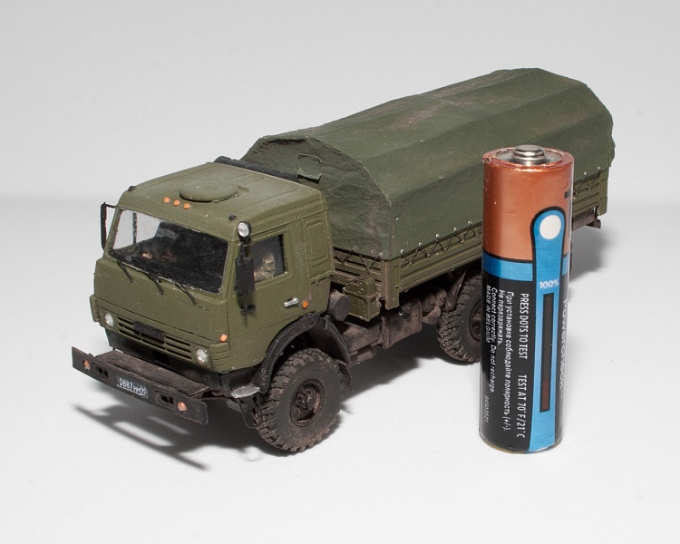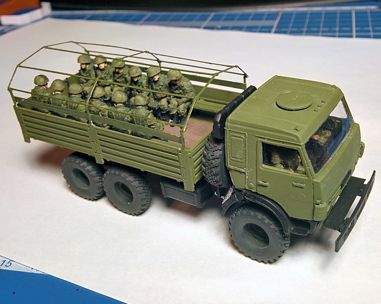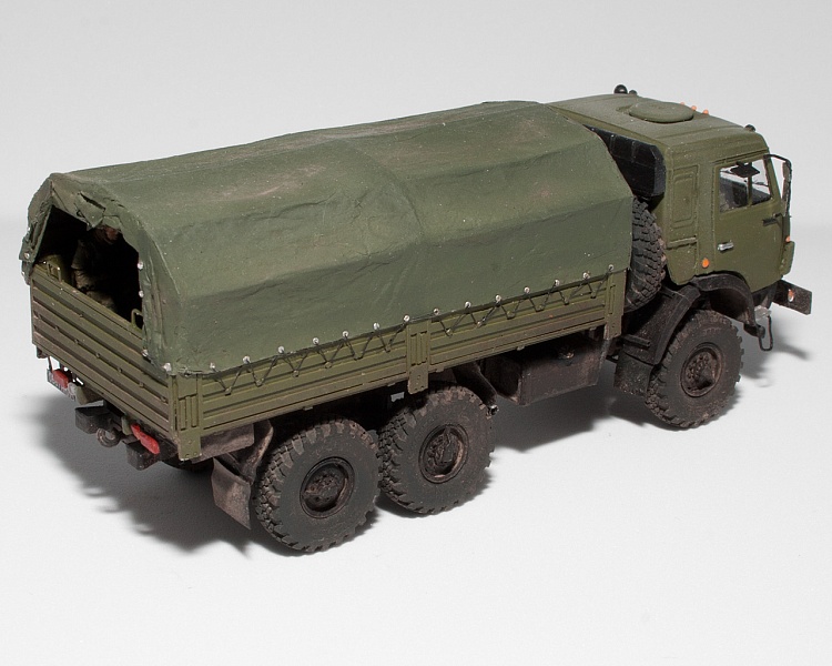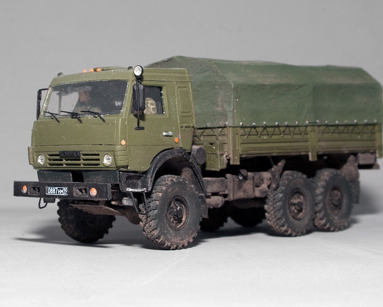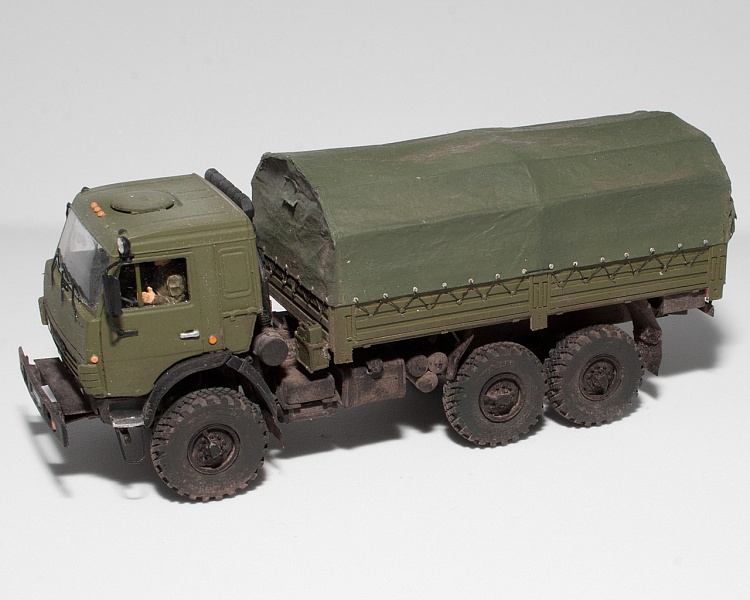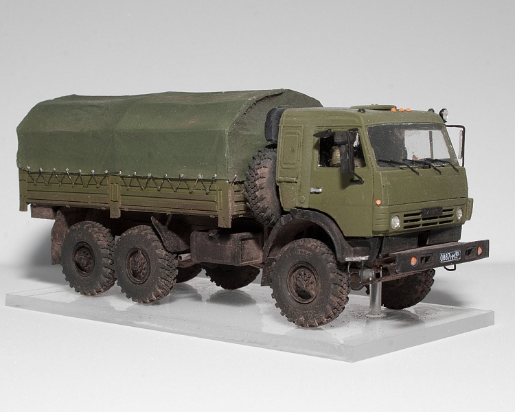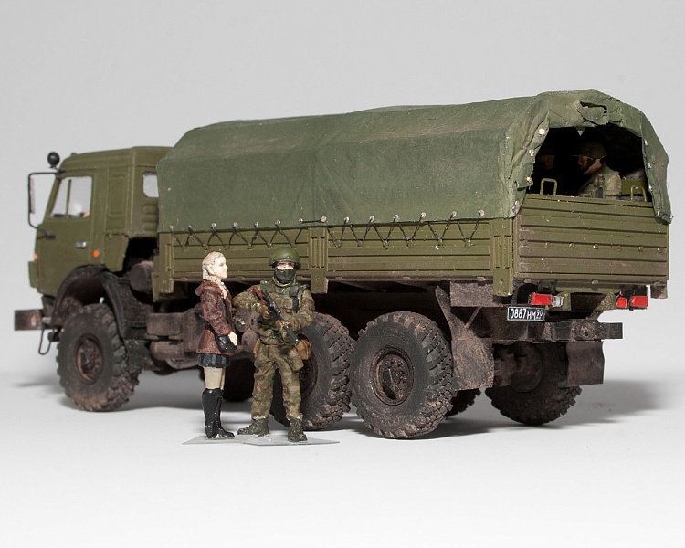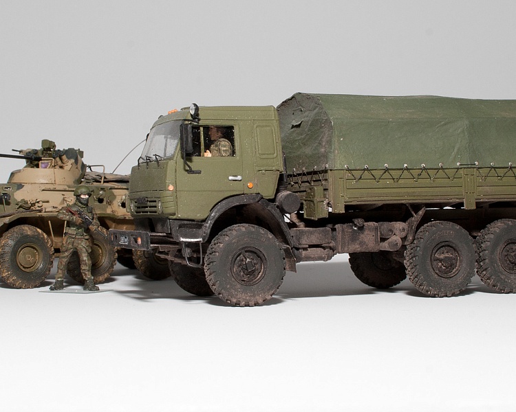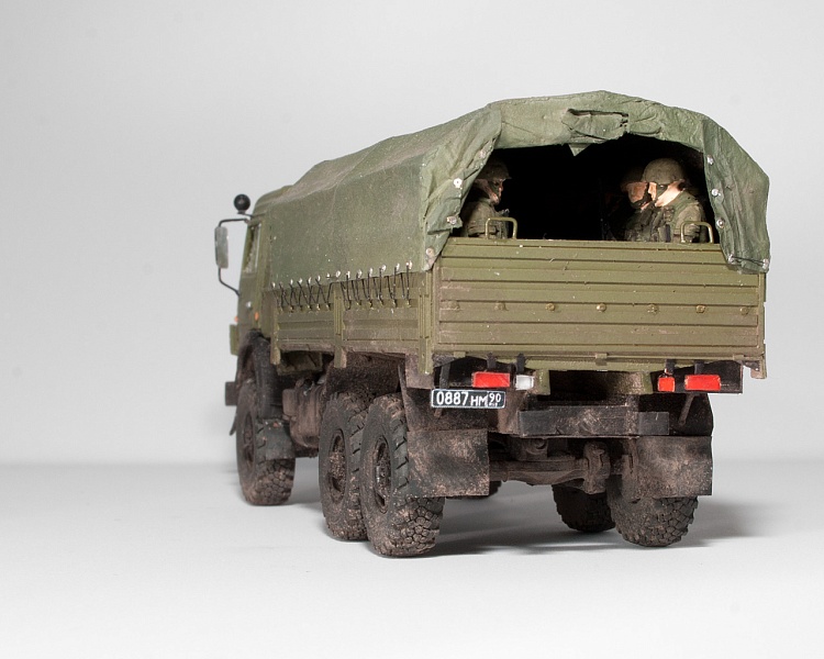 Современные армейские грузовики без преувеличения можно назвать элитой в обществе грузовой автотехники. Одним из ярких представителей этого класса является КамАЗ-5350, заслуживший репутацию надежного, выносливого и многофункционального грузового автомобиля повышенной проходимости. КамАЗ-5350 принадлежит к семейству «Мустанг», куда входят армейские грузовики высокой проходимости. Он является универсальным 6-тонным автомобилем с колесной формулой 6х6, предназначенным для перевозки военных грузов и личного состава, буксировки прицепов и буксируемой артиллерии, а также установки различных систем вооружений. В последнее время идёт активное перевооружение армии новой техникой, и Камаз стал одним из тех образов, которые формируют облик вооружённых сил. Модель Камаза в 72ом масштабе производит только фирма SOWA, но модель у них получилась слабая. Московская фирма Танкоград выпустила коррекционный комплект к набору, состоящий из кабины, двигателя и колёс, который и послужил основой для моей модели. Всё остальное делал из листового пластика, и иногда использовал детали от Урала от ICM. Подробную статью о сборке модели можно найти в М-Хобби 08-2017, отмечу лишь, что бойцы в кузов и кабину взяты от Alex Miniatures, а декалями на номера помогли New Penguin (Народная декаль). Базовый цвет модели – зелёный советский Акан, тент и рама – Тамия. |