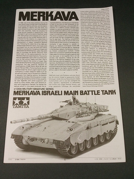 | Ещё раз всем здрасьте! Представляю обзор танка Merkava Mk. 1 от небезызвестной фирмы Tamiya. Набор состоит из четырёх литников ( упакованных в пакетики, ванна корпуса отдельно ), виниловые гусеницы хорошего качества ( вообще мне тамийский винил нравится ), в отдельном пакетике небольшая декаль, сеточка, кусочек прозрачного пластика для имитации смотровых приборов и виниловые втулки катков, инструкция на 2-х языках. Модель сделана под моторчик ( походу старая тамия ), но несмотря на это, качество отливок хорошее, всяких неприятных вещей не обнаружил. В общем очень хороший набор для начинающих, вроде меня, за адекватную цену ( 706 руб. ) Спасибо за внимание. |