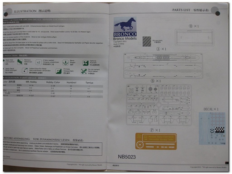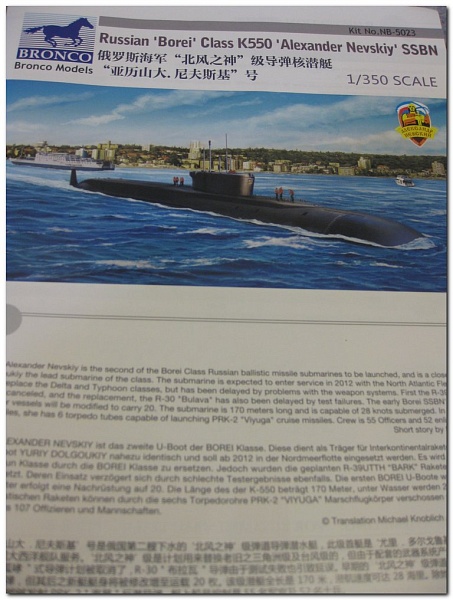 | Всем доброго времени! Представляю Вам обзор модели одного из наших новых стратегических атомачей К 550 " Алксандр Невский". Произведена модель братьями-китайцами на фирме Бронко. Набор запакован в довольно большую картонную коробку с цветной картинкой. Внутри находятся: 1 литник с деталями корпуса, который предлагается собрать из трех частей - нижняя часть корпуса из двух продольных половин, и верхняя часть корпуса. Есть возможность собрать модель с открытыми или закрытыми ракетными шахтами, в которых производитель сымитировал загруженный боезапас, отлив его сразу с верхней частью корпуса. Также можно показать на модели стартующую ракету. 1 литник с деталями, 1 лист с деками, 1 маленькая платка с травленым винтом и несколькими детальками; инструкция, данная в виде книжечки. Литники, деки запаяны каждый в отдельные пакетики, дабы исключить утрату деталей. По качеству литья замечаний нет. Деки содержат разметки, герб корабля, окрас ракет. Цветовая схема дана на последней странице инструкции По стыкуемости деталей пока не могу ничего сказать, это уже выяснится непосредственно при постройке.  |