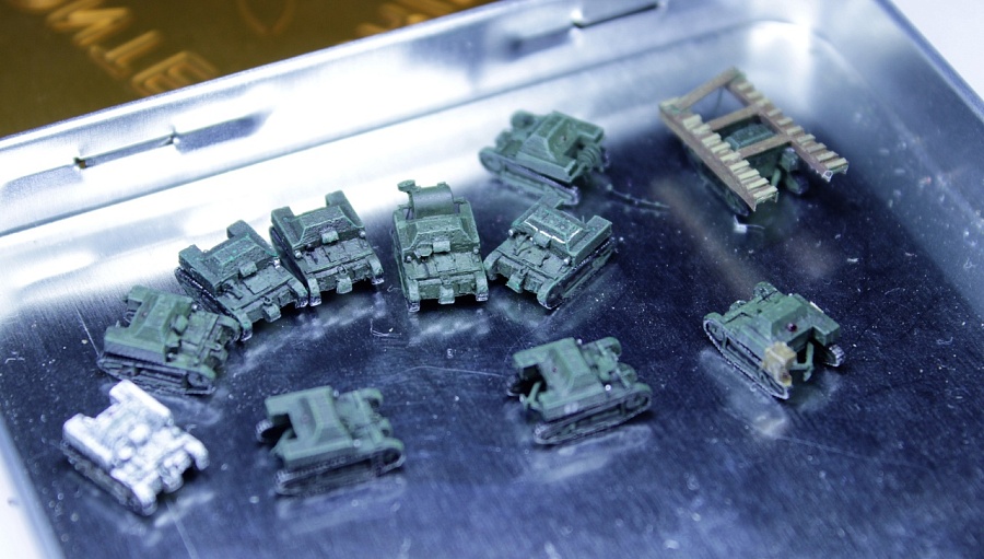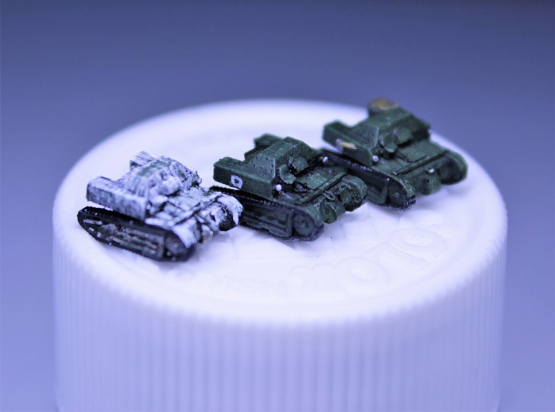 | Собрал и покрасил еще несколько линейных танкеток Т-27 разных вариантов с клепанно-сварными корпусами средней производственной серии. Краски - тамия, смывки-заливки ЗИП-макет, лак тамия. Мастер отчерчен в solidworks, распечатан в фотополимере и оттиражирован в смоле.На последнем фото вся коллекция. Истинный масштаб 1:285 (6мм) С радостью приму критику и советы по покраске!С ув. |