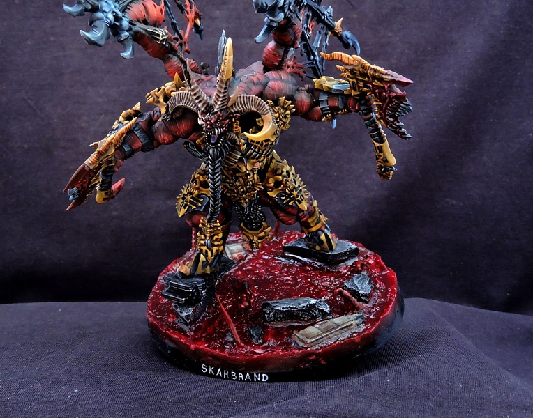 Всем привет. Данная модель особенная, я бы сказал даже, что уникальная, она была подарена мне АДМ 2018, не прошло и пары месяцев я добрался до неё). Окрашена стандартно красками Валехо и Циталеь. Подставка- вода Валехо, Хэви гель для придания структуры Валехо, кисти рук демонов и немного тентаклей. окраска эффектом крови от цитадель. Скарбранд (Skarbrand) - один из самых могущественных высших демонов Кхорна - бога бойни, резни и насилия. Его вожделение крови и черепов было настолько сильным, что даже самому Кхорну пришлось поумерить пыл Скарбранда (Skarbrand). Именно его собственная ярость и привела к падению и изгнанию Скарбранда (Skarbrand) из чертогов Кровавой Крепости Кхорна. Он убил бесчисленное количество смертных во имя Бога Крови, и выжившие говорили о Скарбранде (Skarbrand) только шепотом. Тем не менее, его амбиции намного опередили его мощь, когда он думал бросить вызов самому темному богу - Кхорну. Но сам Кровавый Бог не мог терпеть такую дерзость, пусть даже и от своего лучшего чемпиона Скарбранда. Топор Скарбранда нанес лишь крохотную царапинку на доспехах Кхорна, когда тот получил удар столь невероятной силы, что тело Скарбранда (Skarbrand) пробило потолок во дворце Кхорна и полетело над пустошами хаоса. Наказанный за дерзостьОбессиленный демон летел восемь дней и восемь ночей, перед тем как приземлился в выжженых землях варпа, оставив на земле кратер гигантских размеров. Скарбранд (Skarbrand) очнулся изгнанником, лишенный всех былых почестей и собственных мыслейностей и мыслей. Страшнно наказаный Кхорном, физически сломленный и с рваными крыльями за спиной, Скарбранд (Skarbrand) теперь - не более чем измученная оболочка, заполненная чистой убийственной ненавистью. Там, куда приходит Скарбранд, ярость наполняет сердца каждого - и смертного слугу хаоса, и демонов всех мастей, и даже бестелесных призраков или холодных разумов машин. |