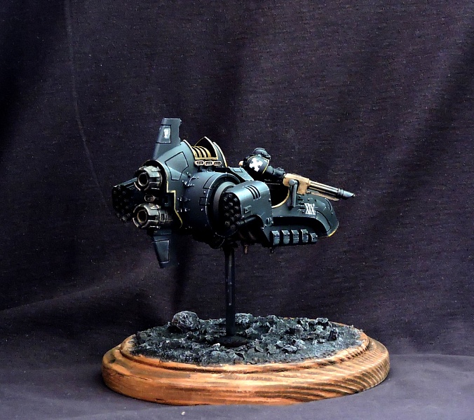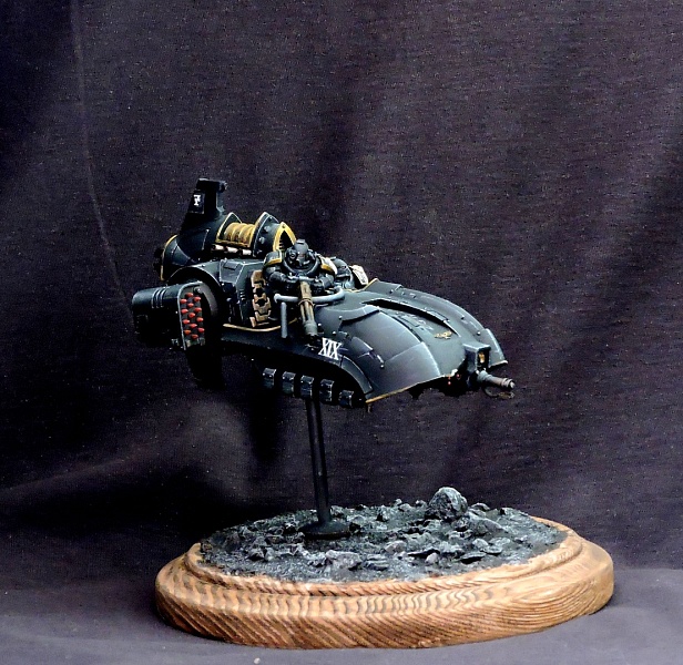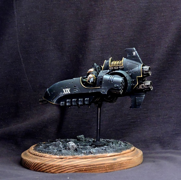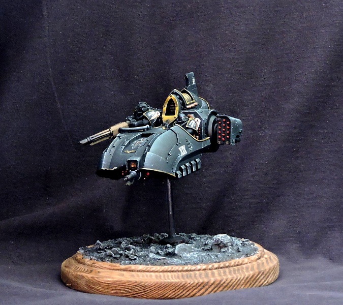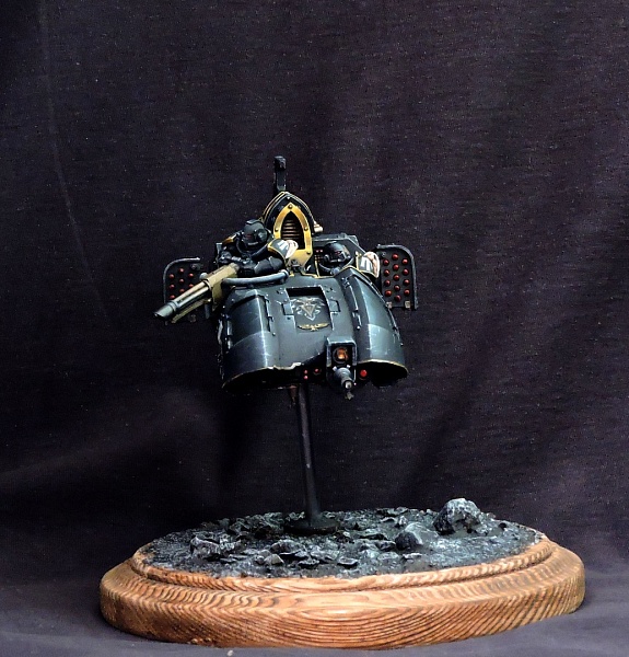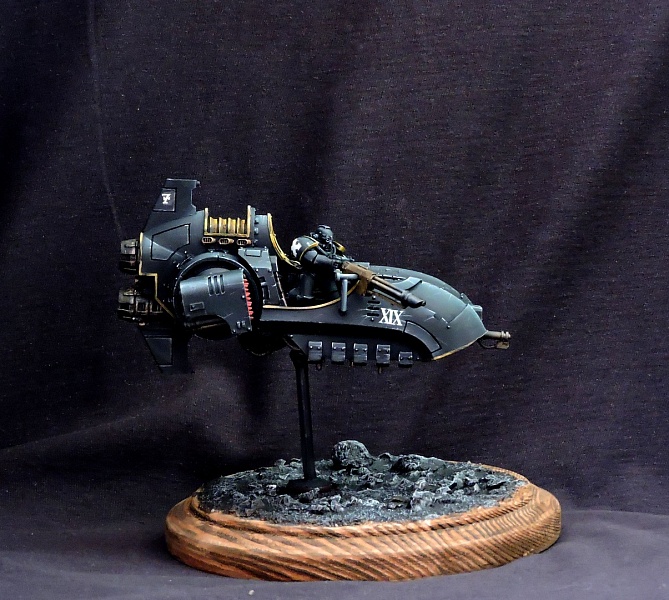 | Лендспидер 30го тысячелетия Гвардии Ворона 19 легион. В зависимости от вооружения и боевой комплектации "Лендспидер" Космического десанта может быть использован для выполнения самых разных задач: разведки, высадки легкого десанта, преследования вражеской техники и многих других. Ремпульсонное поле, использующееся при создании "Лендспидера" , позволяет ему скользить по гравитационному полю планеты и совершать маневры на малых высотах, что недоступно другим видам боевых кораблей. | |