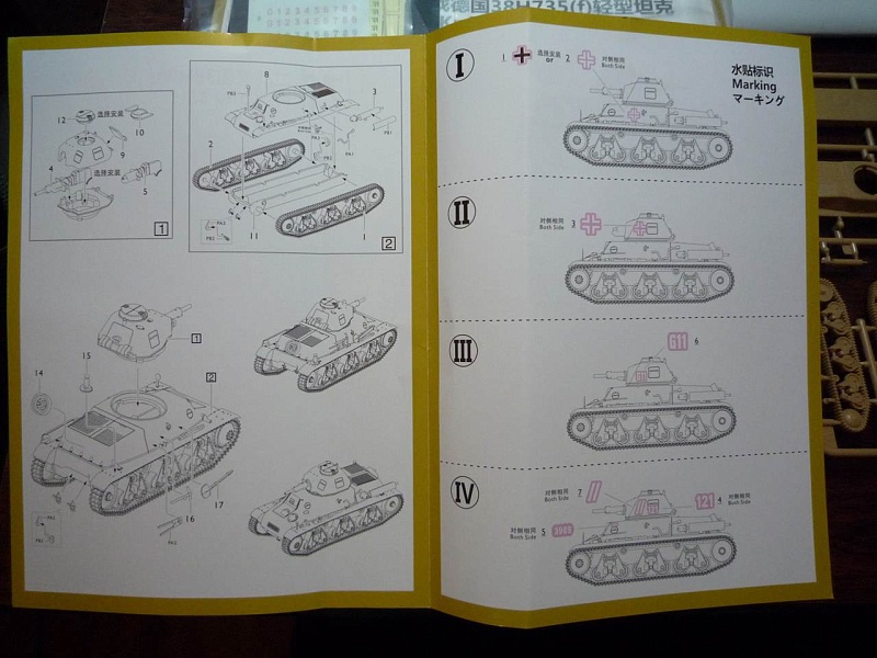 Это французский Гочкис...на инструкции(которая видна)...танк уже в немецком варианте- с командирской башенкой...цвет - панцерграу...можете покрасить прямо на литниках...потом подкрасите...раритет в 72м...откройте фото целиком...качество не очень ...книгу распечатывал сам...