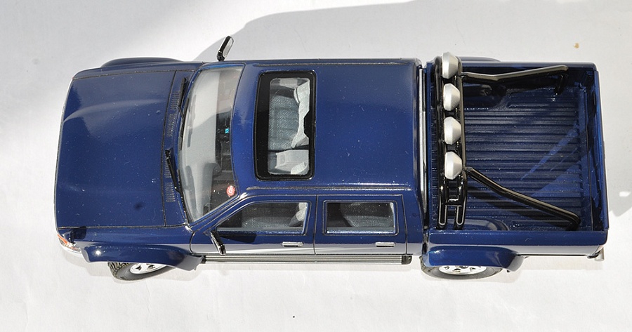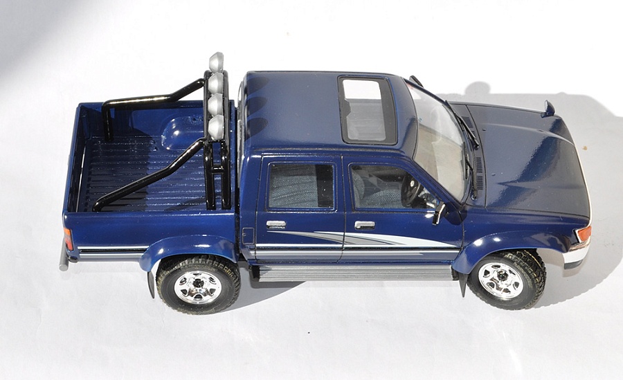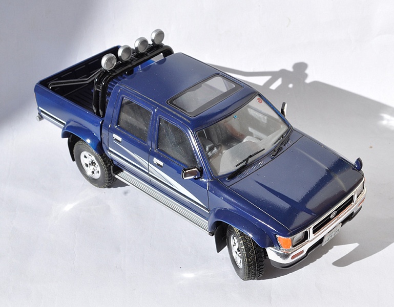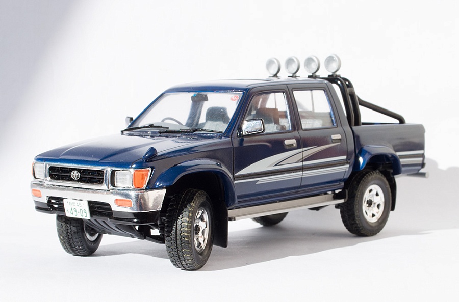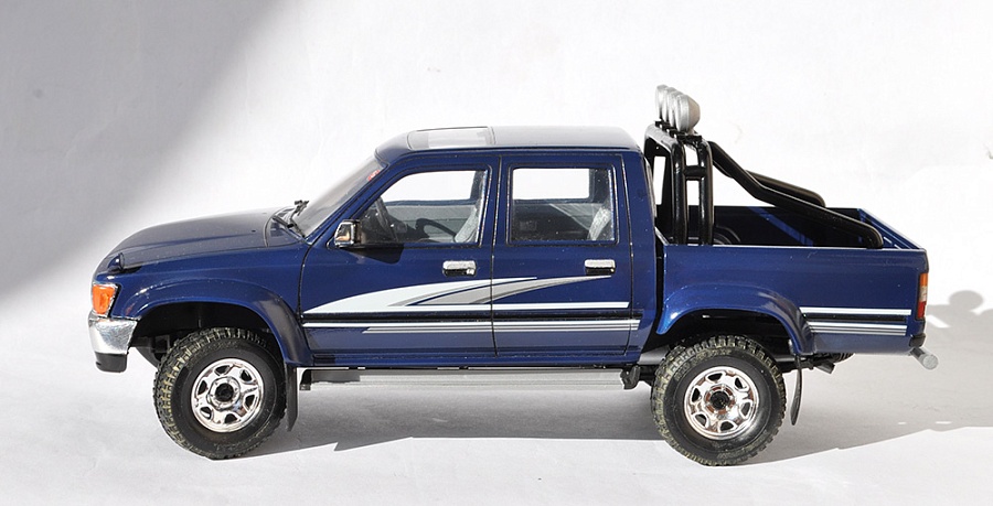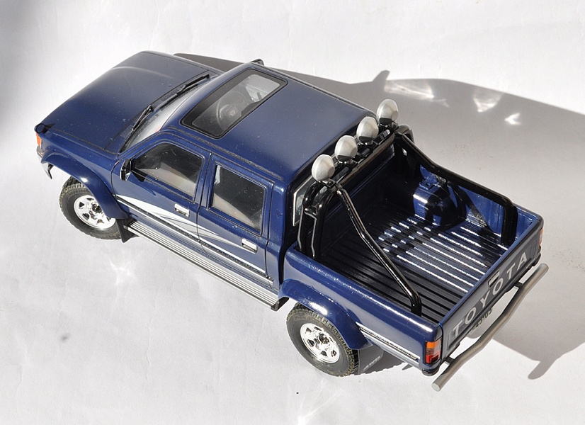 | Отличная модель пикапа TOYOTA от японского производителя. Только почему-то облетел хром с переднего бампера, пришлось обклеивать его фольгой. Сборка практически из каропки, добавил обшивку сидений и коврики на пол. Модель на день рождения подарила жена, она же забраковала излишне пластиковый вид салона. Производитель дает несколько опций: два комплекта дисков — хромовые и под покраску, два варианта порогов, два варианта дуги в кузов, два варианта декалей на борт. Опциями даны крылья и крышки на фары (я не устанавливал). Окрашивал красками от Тамии. В основном акрил, кроме серебрянки (эмаль Х-11). Она оказалась отвратительного качества, после нескольких прикосновений покрытие истирается. Ощущение липкости не проходило и после недели просушивания. Сам я к автомобилю отношусь бережно поэтому вариант показан мытый и не побитый. |