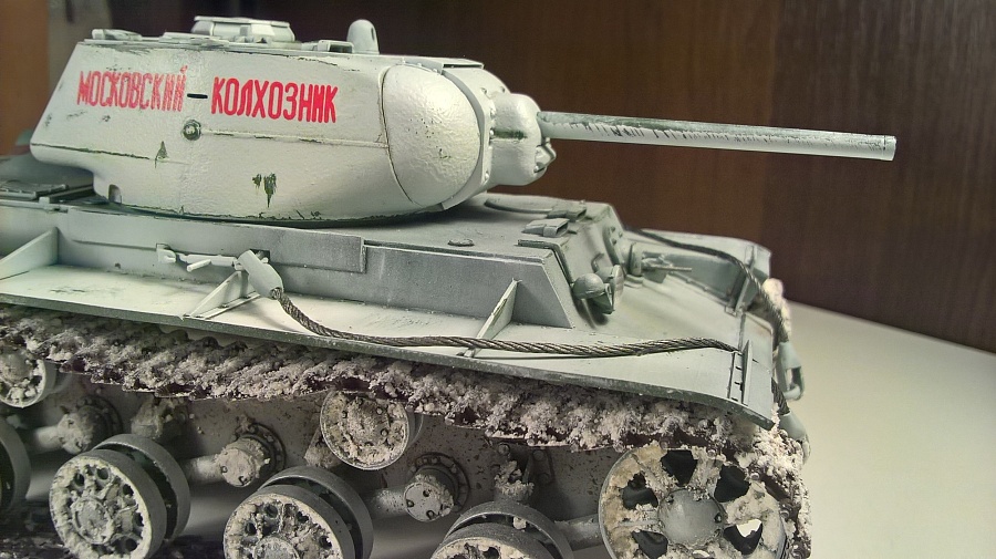 | Представляю вам свою первую модель бронетехники. После множества собранных самолётов и кораблей решил попробовать свои силы в бронетехнике. Хотелось обязательно с металлическими траками с хорошо видимой ходовой. Выбор пал на КВ-1. Сначала купил траки, не вдаваясь особо в детали. Затем оказалось что траки именно на КВ-1С ранних выпусков. Вот так у меня и появился КВ-1С. Именно трумповский долго у нас в стране искал, заказал в одном из московских интернет магазинов. Запасся незнакомой для себя химией и понеслась...Окраска тамия, мр. хобби, звезда. Химия АК, пигменты МИГ, художественные масляные краски. Имитация снега при помощи клея ПВА, соды, масляной краски (краски стоило добавить побольше, т.к. "снег" слегка пожелтел). Дополнения: траки "Мастер клаб", ствол "Абер", опорные катки "ДТ-35", пулемётные стволы из игл. По окраске и количеству снега ориентировался по трём фотографиям прототипа. Модель является прототипом машины из танковой колонны "Московский колхозник", которая была построена на добровольные пожертвования колхозников московской области. 21 танк был передан 14-му отдельному гвардейскому танковому полку прорыва 10-го декабря 1942 года.Полк участвовал в Сталинградской битве и в боях на Северном Кавказе. В августе 43-го полк перевооружился на танки КВ-85. Ожидаю справедливой критики и дельных советов по поводу того, что стоило бы ещё сделать или чего не надо было. Спасибо за внимание. |