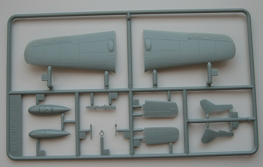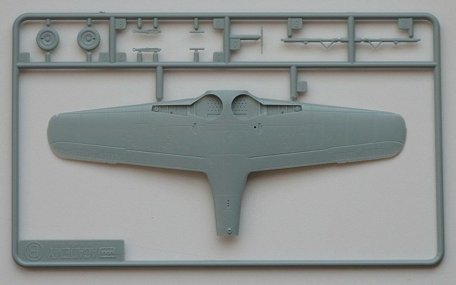 Пластик приятный, дефектов я не заметил, расшивка тонкая и аккуратная, не замыленная. Порадовала расшивка на элеронах и рулях высоты и направления. Стыкуемость обещает быть хорошей. Крыло, судя по всему, должно получиться тонкое. Деталировка, в общем, довольно подробная за исключением движка. Фонарь тонкий и прозрачный, правда, отлит с некоторыми  дефектами по бокам.