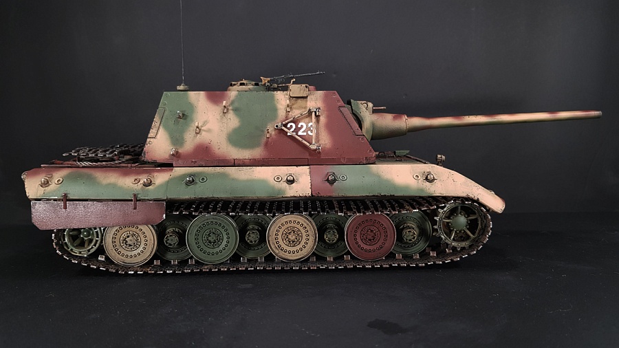 | Очередная версия сверхтяжелого танка Е-100, на этот раз - менее фантазийная, чем машина Трумпетера. Первое отличие, понятное дело - это башня, реально разрабатывавшаяся немцами, в отличии от красивой, но придуманной Трумпом чуть более, чем полностью.В отличии от чудовищных гаубиц, которые впихивали в башню танка запильщики, я решил не извращаться и поставить проверенное орудие 12.8 см KwK 44, оно же Pak 44 от Ягдтигра. На башню добавил командирскую башню, вывод антенны и пулемет к левому люку. Добавил крючки на бортах башни. Сначала хотел вовсе убрать второй ствол над основным калибром - по крайней мере, 7.5 см плевательницы я точно не видел на этом танке. Но потом решил, что 2 см автоматическая пушка может быть вполне годным вторым калибром. Не знаю, насколько быстро она бы наводилась на разбегающихся врагов, но, кто знает?На корпусе я решил сделать "облегченные" экраны, которые при желании можно дополнять снизу навесными щитками из металла или резины, или сетками. Те громоздкие мне никогда не нравились. Крышу МТО, по моде конца войны, я решил частично защитить от авиации - запасными траками. И, самое вопиющее - я убрал фирменные немецкие выхлопные трубы-торчалки, заменив их дефлекторами, которые при желании могут откидываться наверх.По сборке - в принципе, всё собирается неплохо, напилинга совсем мало. Но вот траки, которые должны быть живыми и собираться "на щелчок" - с ними были проблемы. Они соединяются за счет маленьких пупырышков, которые входят в углубления другого звена. Но при сборке эти пупырышки срезаются другим звеном - у меня примерно каждый пятый. И их пришлось сажать на клей. Более того, уже собранные "живые" куски потом разваливались от малейшего движения. Красил стандартно - Краски АКАН, смывка МиГ и Тамия. Матовый лак Тамия. |