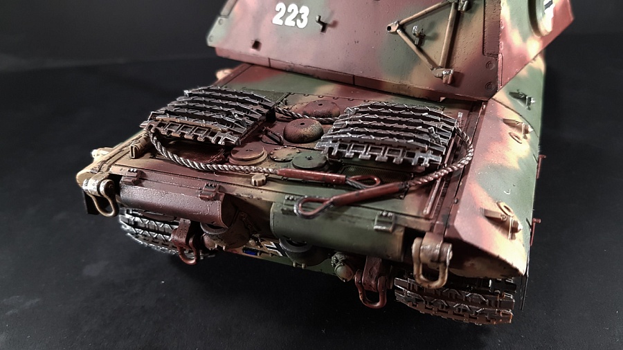 Трос думаю за пределами допустимого даже. Это реально плетеный корабельный канат. Дело не в его белесости, а в толщине и как он гнется. В свое время изучал эту тему для своего Мауса, хотелось поставить адекватный трос. У Тигра 2, самой тяжелой серийной машины, был 32мм, т.е. 0.91мм в мастшабе. На Маус я поставил 42мм, т.е. 1.2мм в масштабе. Я искал нагрузку на разрыв у разных торосов, тот что 42мм выдерживает 400-600 тонн. При весе Мауса 190, с запасом. Такой бы на Е-100 тем более был с запасом. Здесь сложно оценить по фото, но на вид миллиметра 2-2,5.