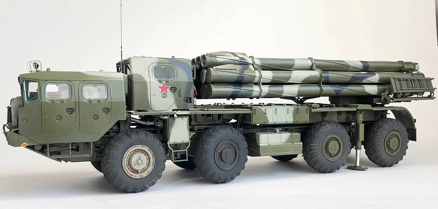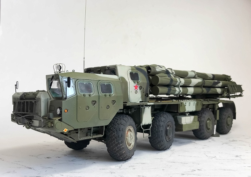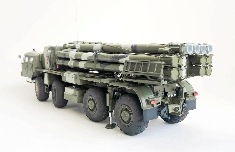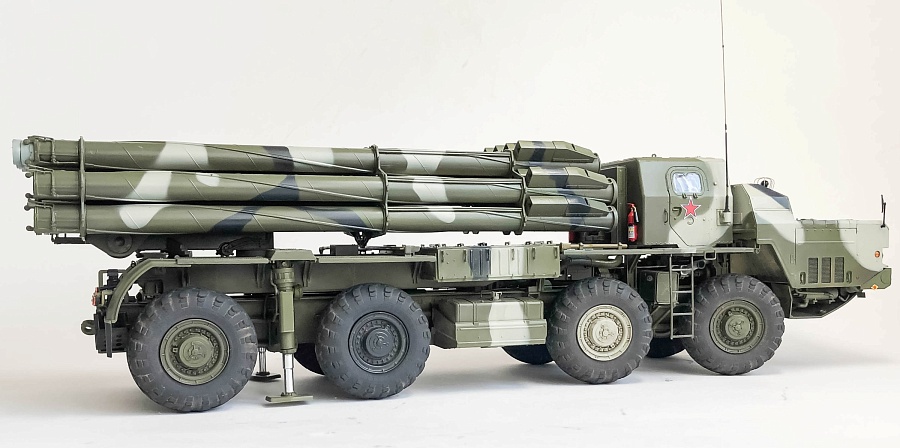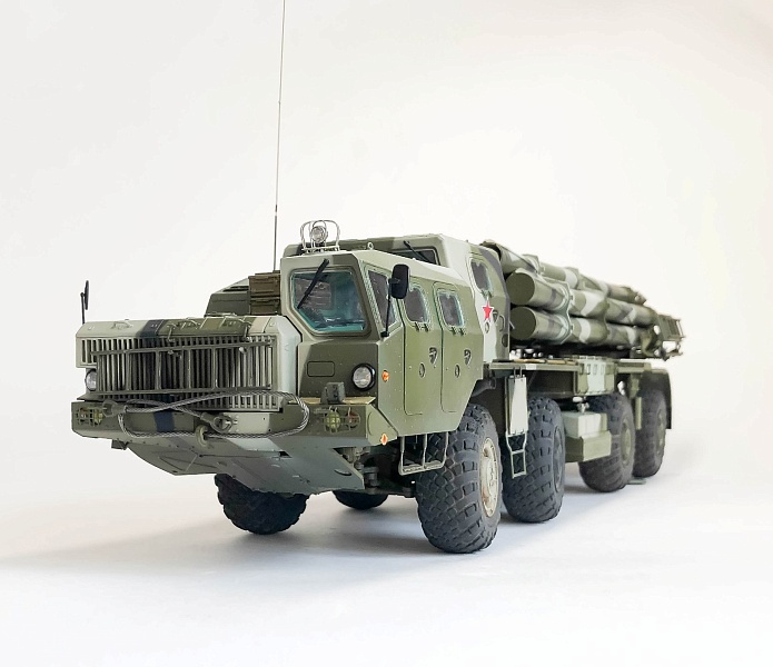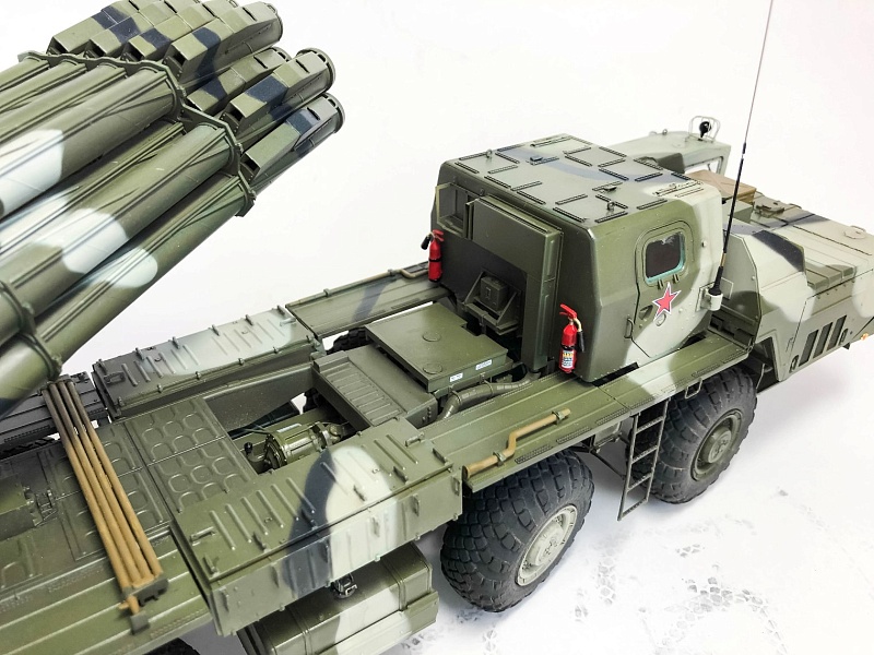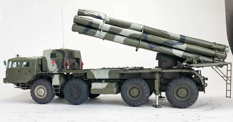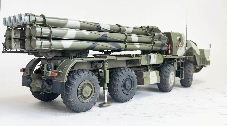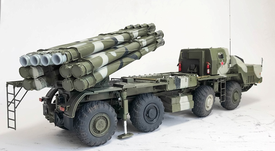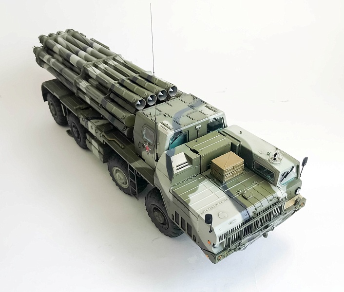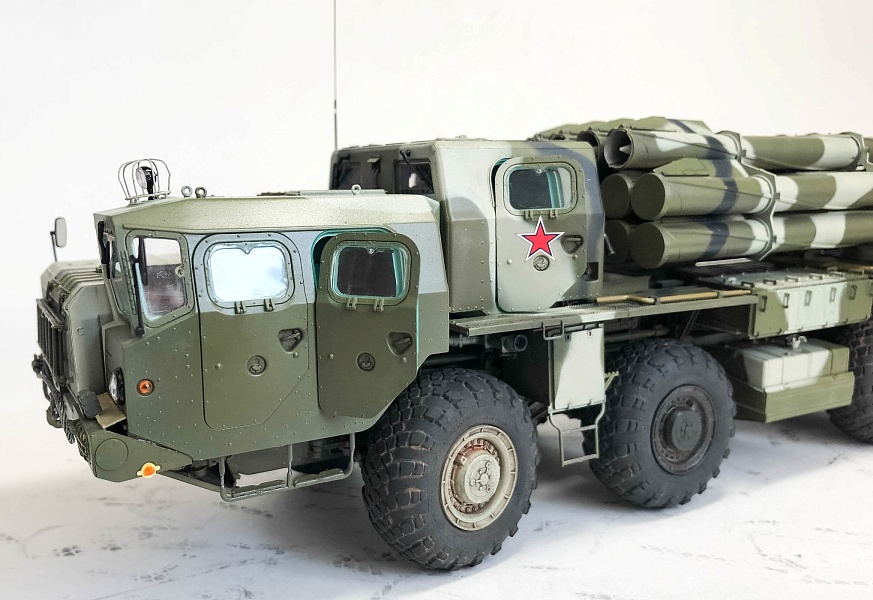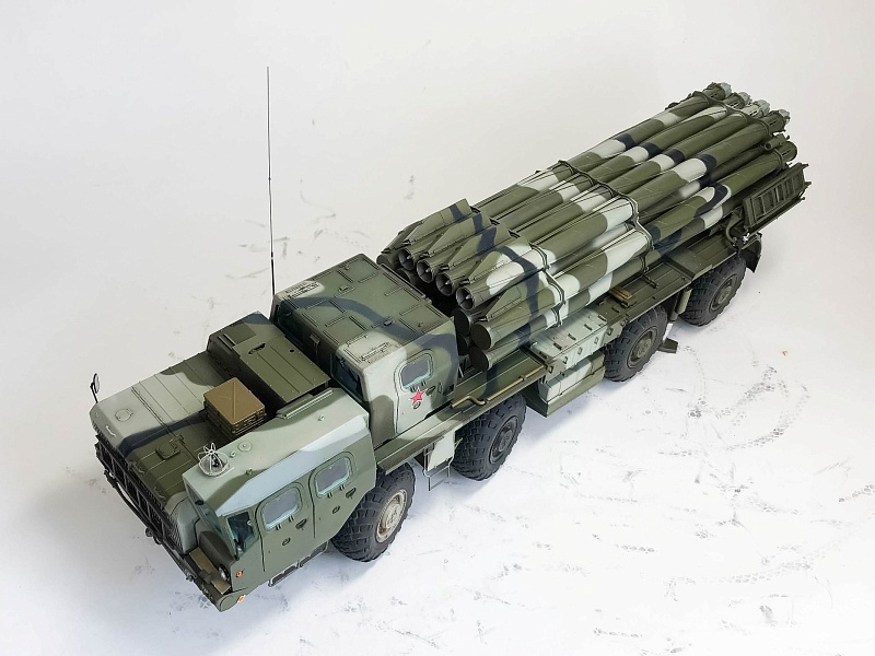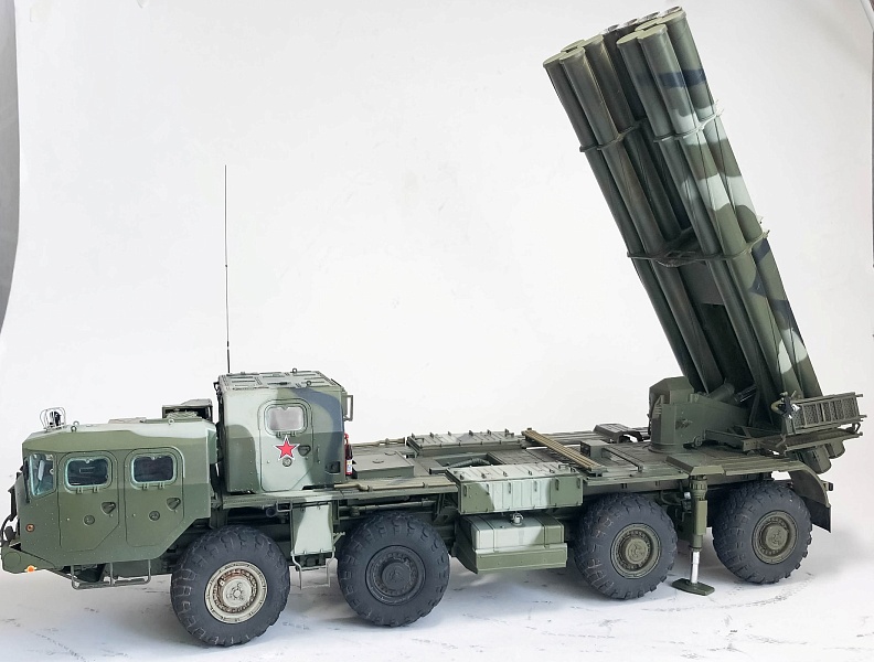 | Модель РСЗО 9К58 Смерч от фирмы MENG.Сборка из коробки.Собирал ее года 2.то начинал то забрасывал.Модель достаточно сложная в сборке.Много деталей надо красить перед склейкой .много мелких деталей и т.п.Но в целом модель отличная.Про сборку и подгонку направляющих я думаю все знают.На некоторых литниках попадается стык от пресс форм.Окраска тамия, ганза ,акан.Двери не приклеены,можно сделать открытыми.Добавил топливные трубки на баки и двигатель правда их практически не видно. | |