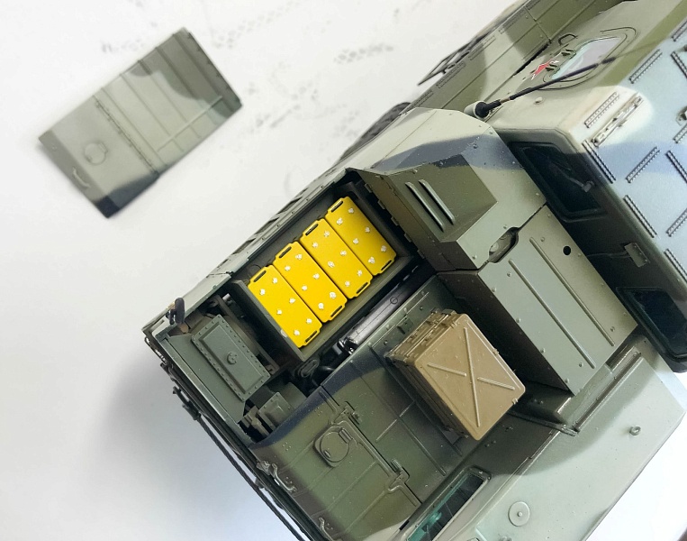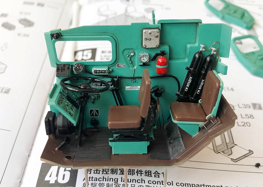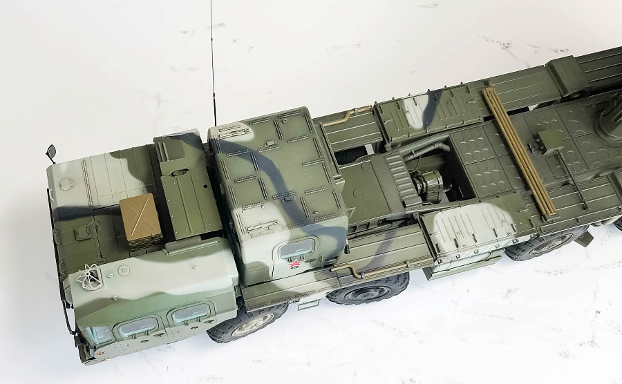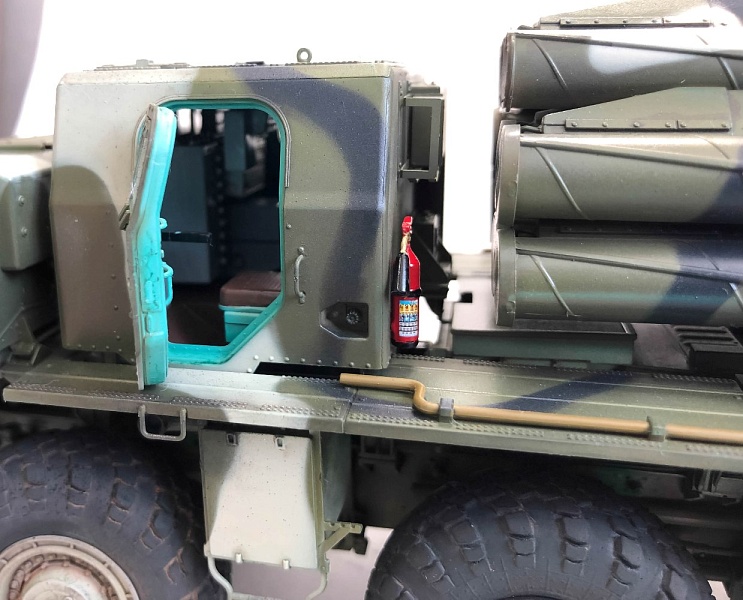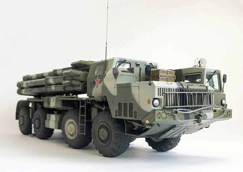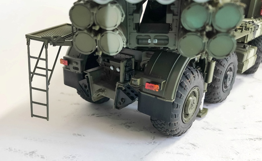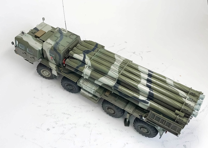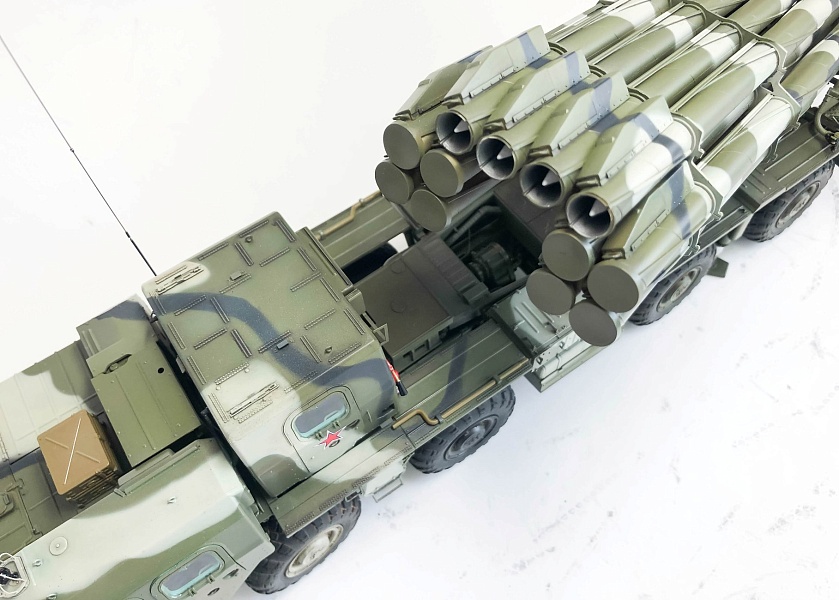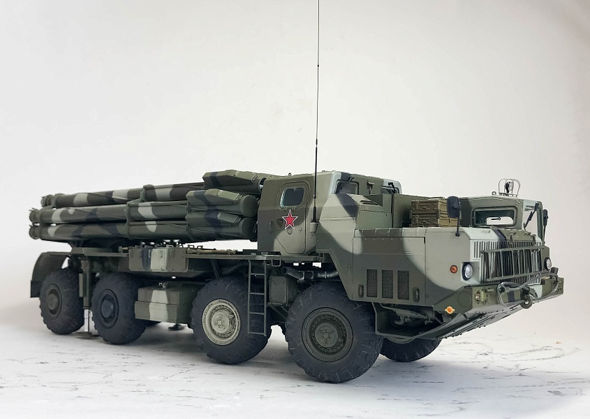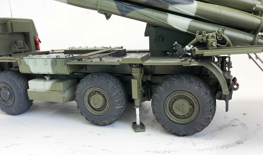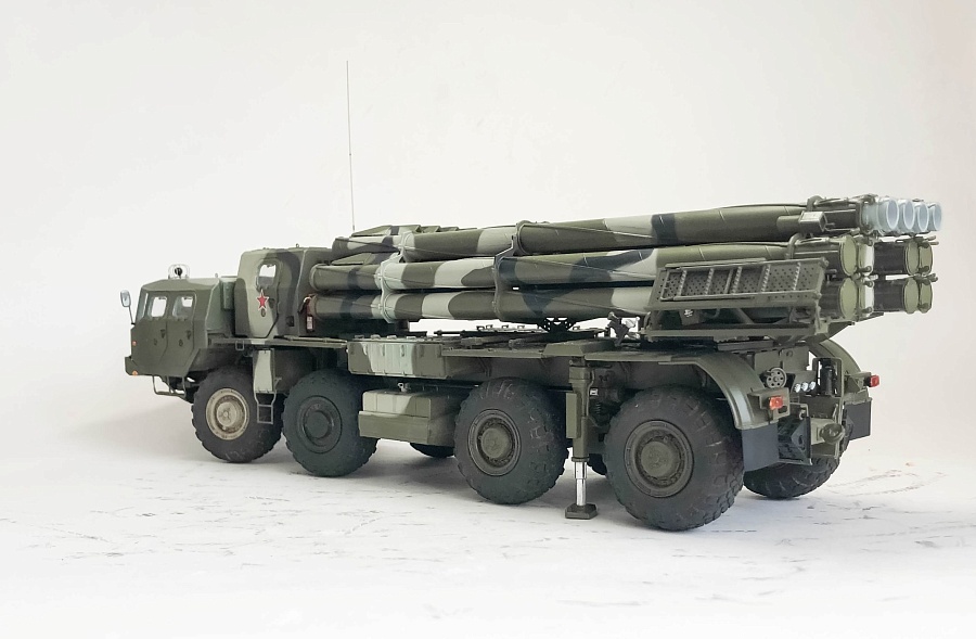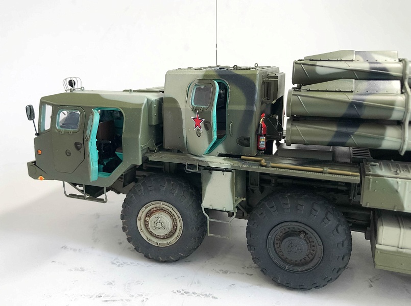 | Модель РСЗО 9К58 Смерч от фирмы MENG.Сборка из коробки.Собирал ее года 2.то начинал то забрасывал.Модель достаточно сложная в сборке.Много деталей надо красить перед склейкой .много мелких деталей и т.п.Но в целом модель отличная.Про сборку и подгонку направляющих я думаю все знают.На некоторых литниках попадается стык от пресс форм.Окраска тамия, ганза ,акан.Двери не приклеены,можно сделать открытыми.Добавил топливные трубки на баки и двигатель правда их практически не видно. | |