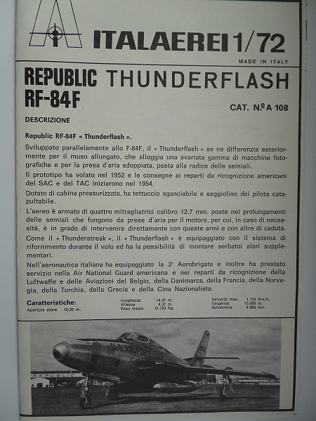| Уважаемая публика, разрешите представить обзор, еще одного старенького набора от Италери. Модель американского разведчика РФ-84Ф Тандерфлэш, глубоко модифицированный вариант Ф-84Ф Тандерстрайк. Коробка со старым италовским дизайном, даже название фирмы-производителя написано по другому. Внутри два пакетика с литниками серебристого цвета, один пакетик с прозрачными деталями и декой, плюс инструкция. Модель имеет бедную детализацию, напоминает фиксовский Тандерстрайк, такой же внешний, грубый крой. Мелкие детали сделаны упрощенно, кабины пилота нету вообще, передняя стойка отлита вместе с колесом, из плюсов можно отметить, только возможность сделать вариант с открытым фонарем, опять же, при отсутствии детализации кабины пилота - этот вариант выглядит странно. Прозрачные детали даны отдельной рамкой, на ней фирменная подставка, окна фотокамер и детали фонаря. Фонарь состоит из двух деталей, прозрачный без искажений, но его толщина будет видна, при открытом варианте. Инструкция проста как и сама модель, в ней же схема окраски. Декаль на два варианта: ВВС Италии и ВВС... Бельгии. Набор древний, чтобы из него сделать более менее модель - нужно вооружится надфилем и скрайбером, а самое главное терпением:) | |