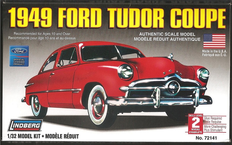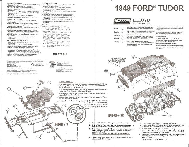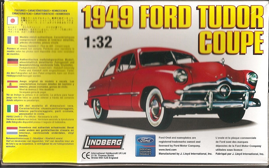 | Модель Ford 1949 года стала этапной в смене поколений и первой послевоенной моделью Ford. Уровень передних крыльев поднялся до уровня капота, бока стали гладкими, капот широким. Двигатель остался от прошлого поколения Ford, но модель получила независимую переднюю пружинную подвеску. Модель выпускалась в модификациях 2 (tudor) или 4 (fordor) дверный седан, 2-х дверное купе, 2-х дверный кабриолет и универсал (station wagon). Теперь о модели. На коробке нарисована модификация Tudor Coupe (двухдверное купе), и названа модель так-же, но в коробке модель Tudor Sedan (двухдверный седан). Отличить можно по форме задних боковых стекол. В коробке четыре литника с деталями из белого пластика, и один прозрачный. Существенного облоя и утяжин не обнаружил. Крайне неудачные следы толкателей на нижней части кузова. Подвеска, выхлопная система даны крайне упрощенно, Капот не открывающийся, двигателя нет. Колеса собираются из 2-х пластиковых деталей, и к сожалению замены им на ebay в масштабе 1/32 не обнаружил. Боковых стекол нет, только лобовое, заднее и пе6редние/задние трегульники. Будем считать что пассажирам жарко. На внутренней части боковин кузова есть попытки изобразить внутреннюю часть дверей, но опять следы от толкателей. Хромированные детали отсутствуют, несмотря на то, что хрома на машине должно быть довольно много. Вообще членение кузова верхняя/боковые части мне показалось спорным, посмотрим как это все сойдется. Инструкция на 5 языках, естественно кроме русского. Модель оставляет впечатление простенькой но качественной по исполнению (и вполне соответствует своей скромной цене), неясно, почему она маркирована Skill level 2, ИМХО больше похоже на 1. |