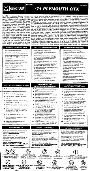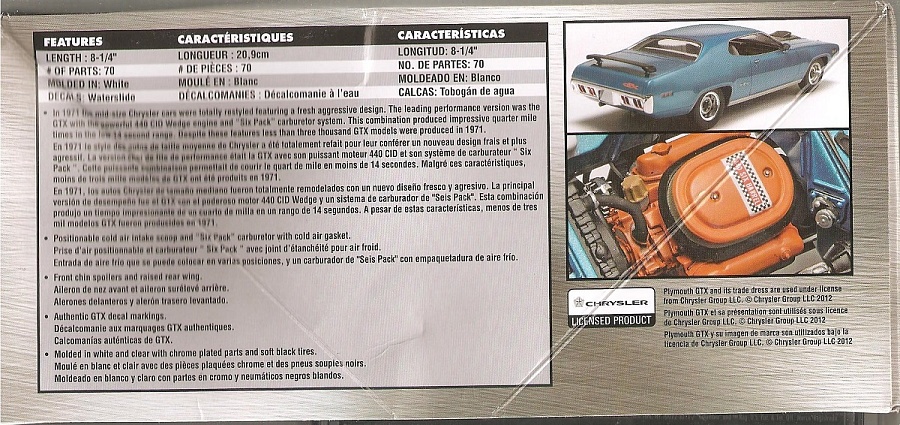 | Plymouth GTX был представлен в 1967 году как спортивная версия дорогого седана Belvedere, получивший кузов купе и двигатель 7,2 литра., но уже в 1968 году получил неожиданного конкурента - RoadRunner от своей-же компании, гораздо более дешевого и практически неоличимого по дизайну. Когда в 1969 году на Roadrunner стал доступен двигатель 440, продажи GTX получили еще один удар, и стали отставать от продаж RoadRunner. В результате, в 1971 г. GTX прекратил свое существование как отдельная модель, и стал более дорогой версией RoadRunner. GTX начав свою недолгую историю как спортивная версия роскошного автомобиля, закончил как роскошная версия спортивного. Модель Revell/Monogram представляет GTX 1971 г. в кузове хардтоп (по крайней мере средняя стойка осутствует) с двигателем 440 c.i., судя по штампу на отливке модель 1984 года, но дефекты литья отсутствуют. Детализированное подкапотное пространство, подвеска, двигатель, система выхлопа и интерьер. Колеса из мягкого материала, хромированные колесные диски. Прозрачные детали без боковых стекол. |