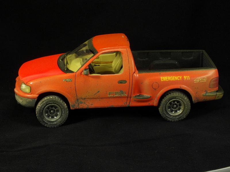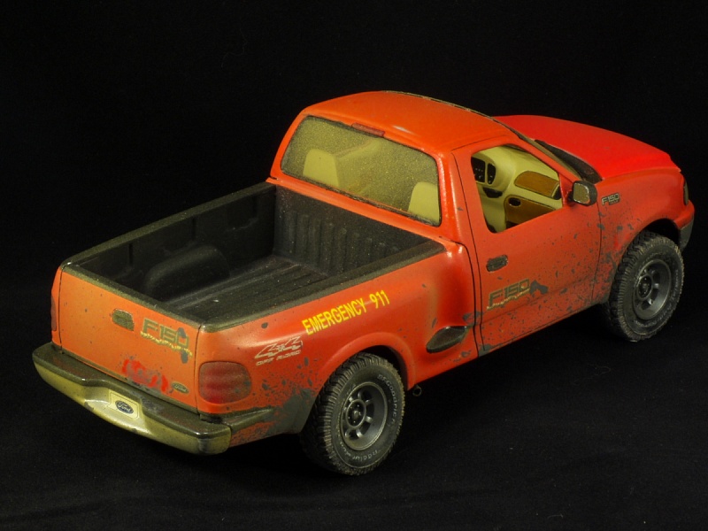 | Пикапчик F-150, модель многострадальная, красилась и смывалась несколько раз, и в конце концов была замазана грязью чтобы скрыть косяки сборки и окраскиИзображает рабочую лошадку члена добровольной пожарной дружины в глубинке оклахомщины. Капот был куплен на разборке взамен помятого. |