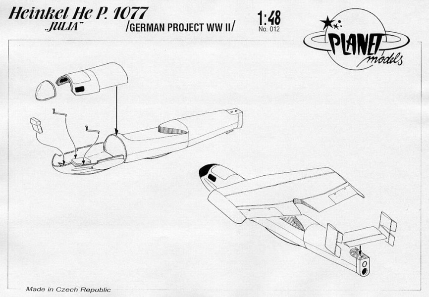Немецкий ракетный истребитель Heinkel P.1077. Работы над проектом начались летом 1944 года. Подробнее о нём можно посмотреть тут. Модель из смолы от фирмы Planet models в масштабе 1/48 (номер по каталогу PLT012) упакована в картонную коробку с верхним открытием. Литьё нормального качества. Минимум деталей, что и понятно – самолёт имел относительно небольшие размеры и не самую сложную конструкцию. Ваку-фонарь и декали смотрятся отлично. Инструкция вполне информативна.Модель оставляет приятные впечатление. Набор может представлять интерес для любителей темы Luft46 в 48-м масштабе. При написании обзора использованы сканы инструкции с сайта www.cmkkits.com. |