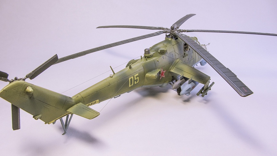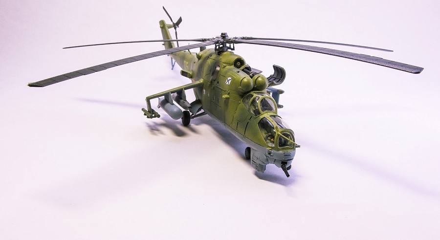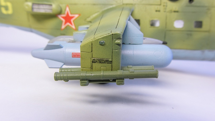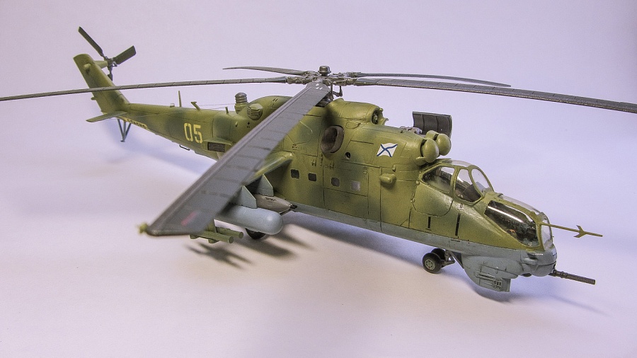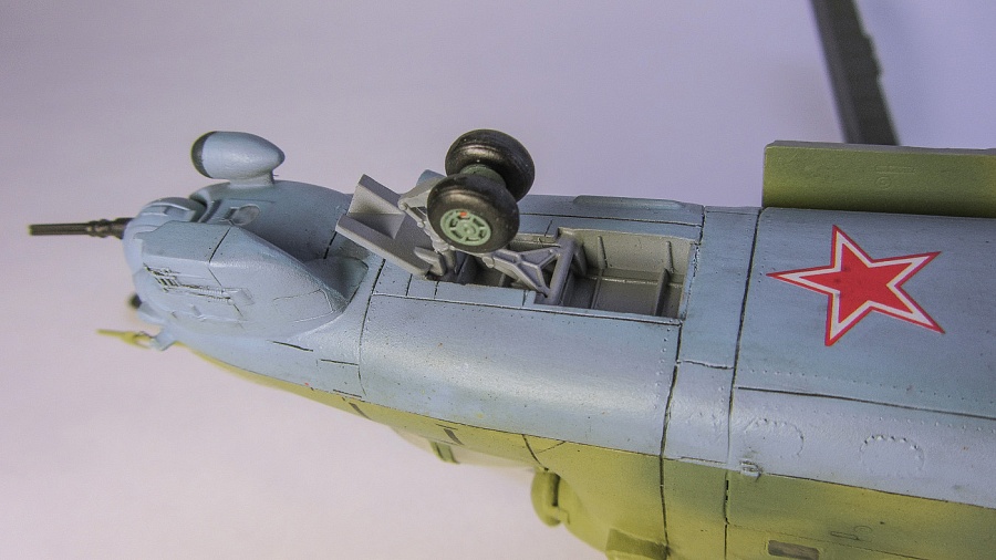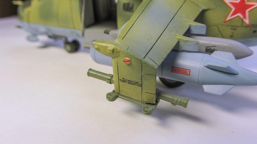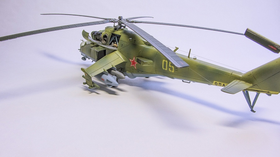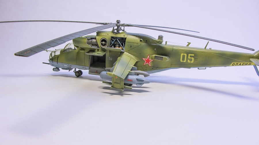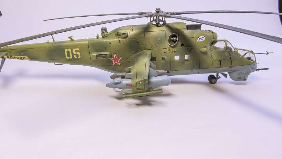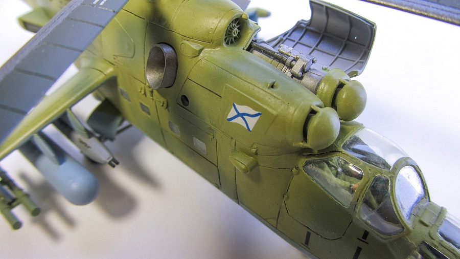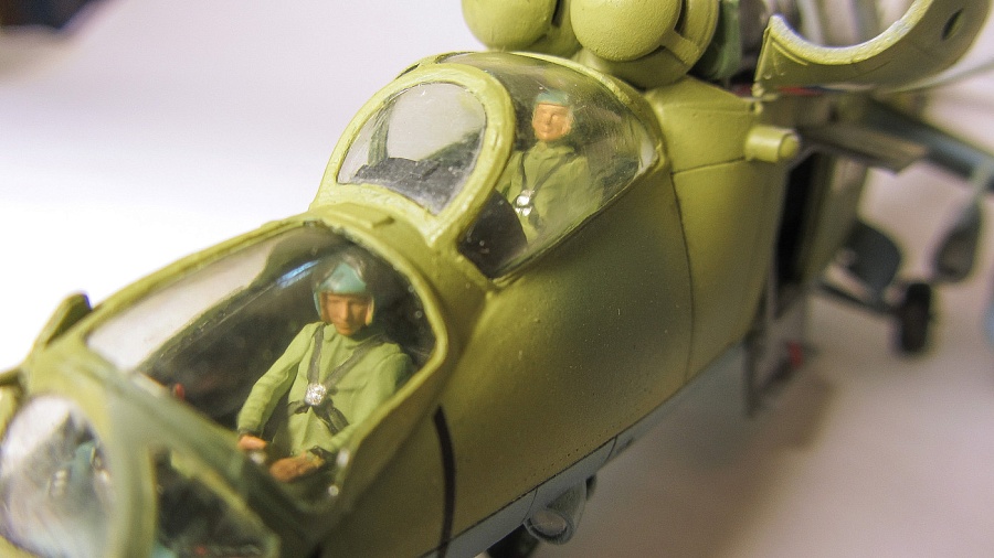 Перечисляю то, что увидел - лопасти покрашены неверно, такой окраски на Ми-24 никогда не было, на двигателях маслобаки коричневого, а не зеленого цвета, круглые бачки в редукторном отсеке справа по полету - красные (противопожарная система), слева по полету - серо-голубые (это гидроаккумуляторы гидросистемы), редуктор не голубой, а серо-голубой, как и весь отсек, ниши стоек шасси тоже должны быть в цвет низа фюзеляжа, цвета камо не попали, но сама окраска подкупает своей аккуратностью, летчики улыбнули - такого цвета комбезов российского (советского) производства не видел, ЗШ на голове у летчиков должны быть белыми, а не голубыми. Пулемет должен быть в походном положении - строго по оси вертолета и максимально поднят вверх.