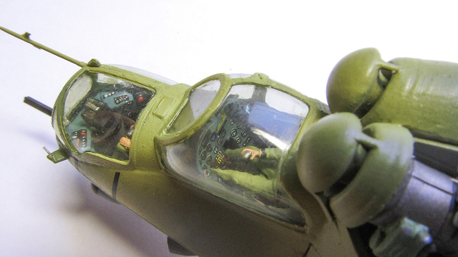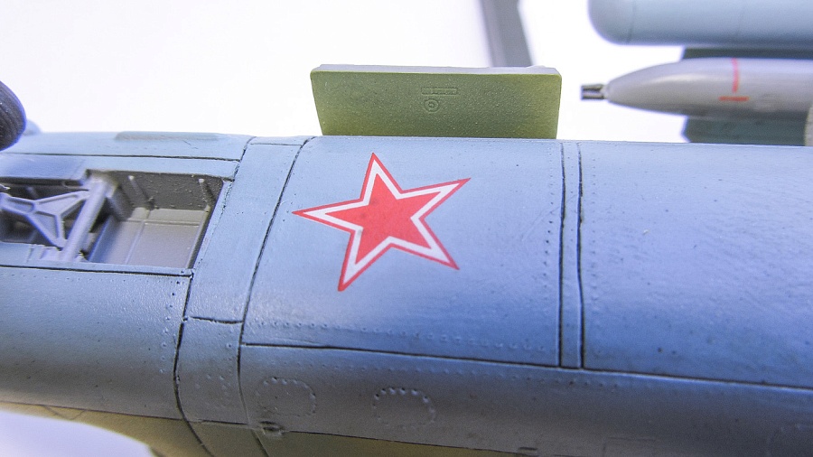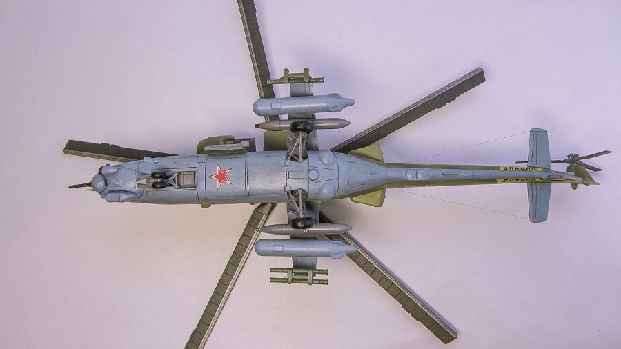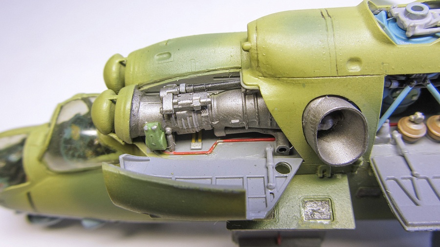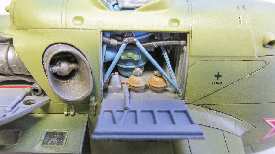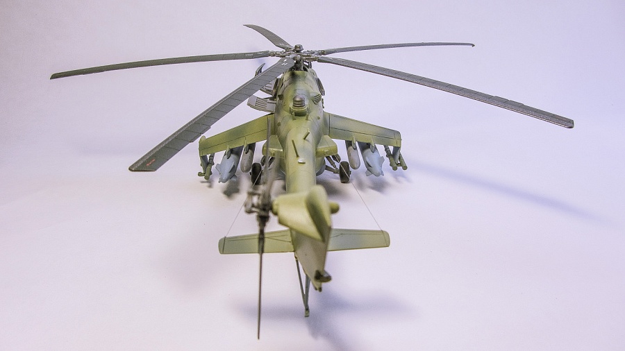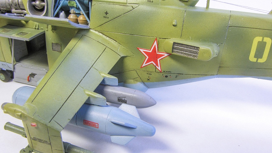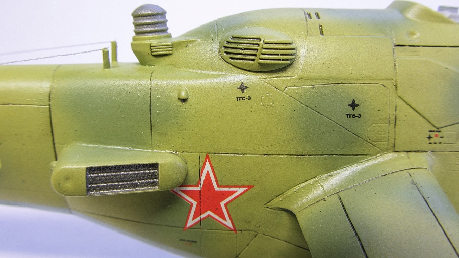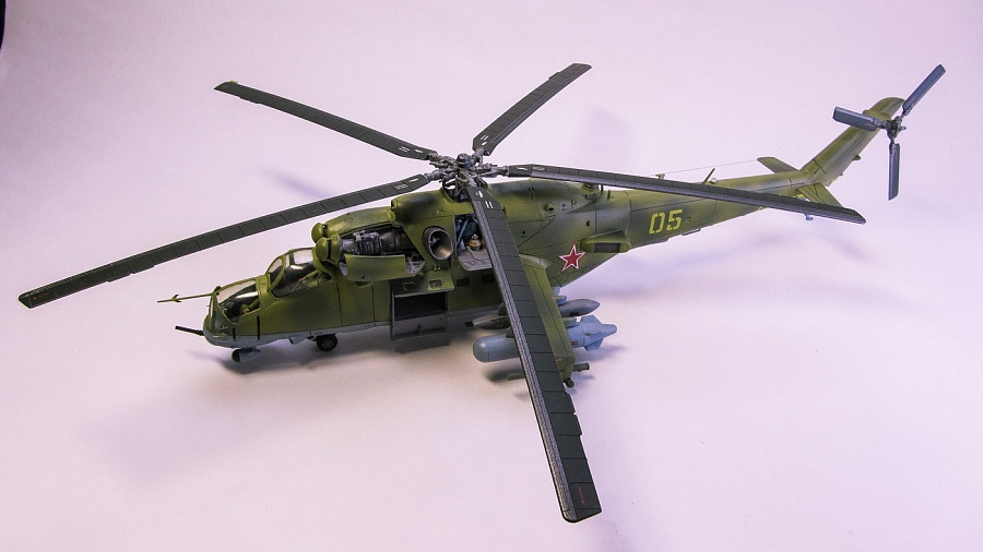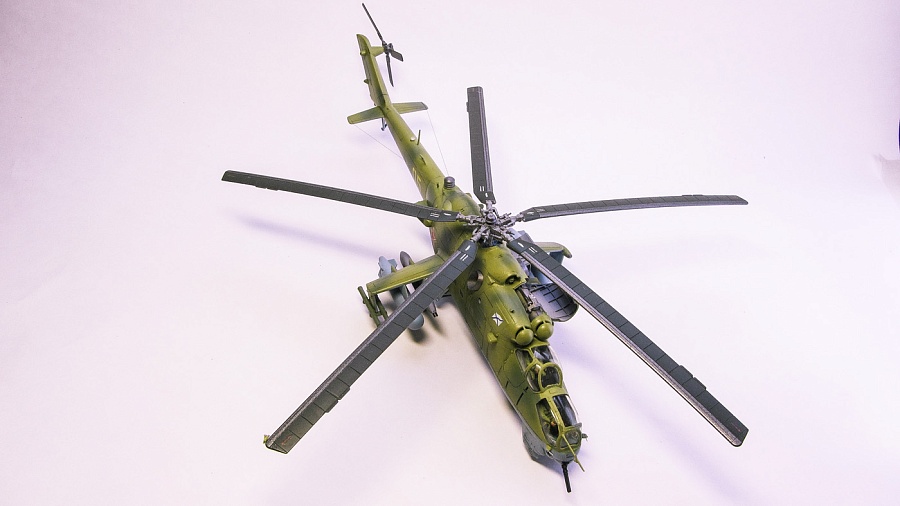 Перечисляю то, что увидел - лопасти покрашены неверно, такой окраски на Ми-24 никогда не было, на двигателях маслобаки коричневого, а не зеленого цвета, круглые бачки в редукторном отсеке справа по полету - красные (противопожарная система), слева по полету - серо-голубые (это гидроаккумуляторы гидросистемы), редуктор не голубой, а серо-голубой, как и весь отсек, ниши стоек шасси тоже должны быть в цвет низа фюзеляжа, цвета камо не попали, но сама окраска подкупает своей аккуратностью, летчики улыбнули - такого цвета комбезов российского (советского) производства не видел, ЗШ на голове у летчиков должны быть белыми, а не голубыми. Пулемет должен быть в походном положении - строго по оси вертолета и максимально поднят вверх.