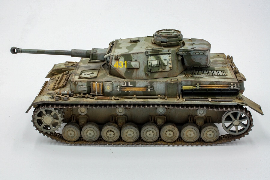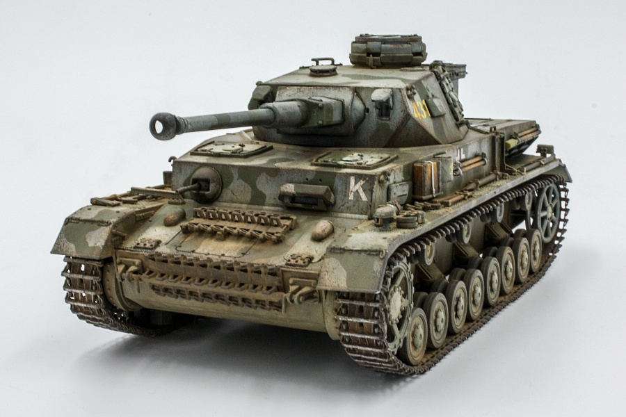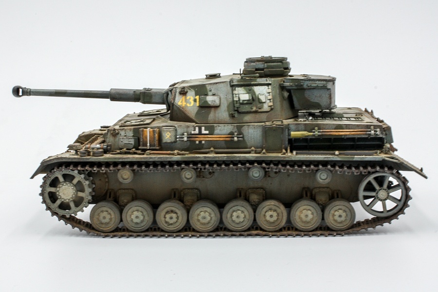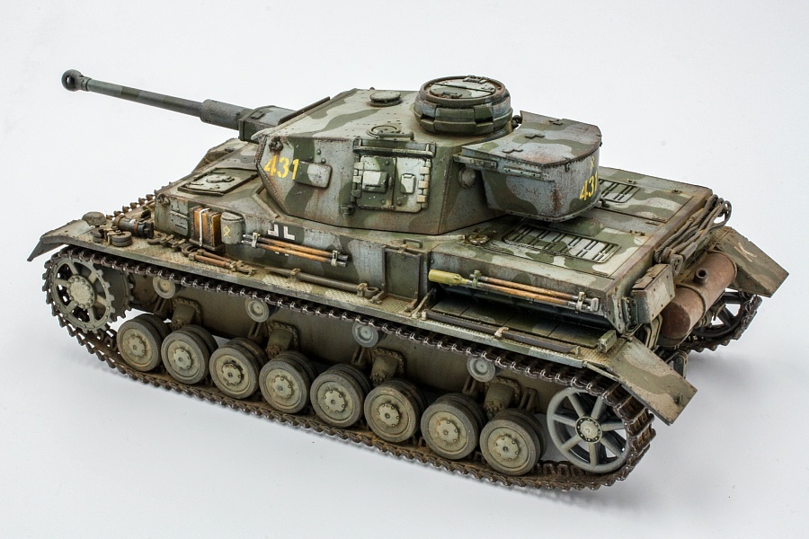 | KIT N.6360 , модель собрана практически из коробки, заменил только троса, у Дракона они плохо гнутся. Танк хоть и несет опознавательные знаки 14 танковой дивизии, но образ скорее собирательный. Попробовал первый раз панцергрей от Ганзы. Двоякие впечатления, вроде неплохой оттенок, я нанес еще голубой фильтр, когда работал с маслом, кое где использовал синий ультрамарин. И вроде совсем капельку для затемнения, но при определенных ракурсах в тех местах отдает синевой. В итоге и вроде неплохой цвет, а что то вроде не то. К весне 1942 г., немцы уже вовсю камуфлировали технику по базовому серому кто во что горазд. Я нанес зелено-оливковые полосы по трафарету. Хотя на фото в интернете танк под номером 431 имеет скорее коричневые пятна. (В инструкции советуют коричневые пятна по темно-желтому). Фото постараюсь на днях переснять. |