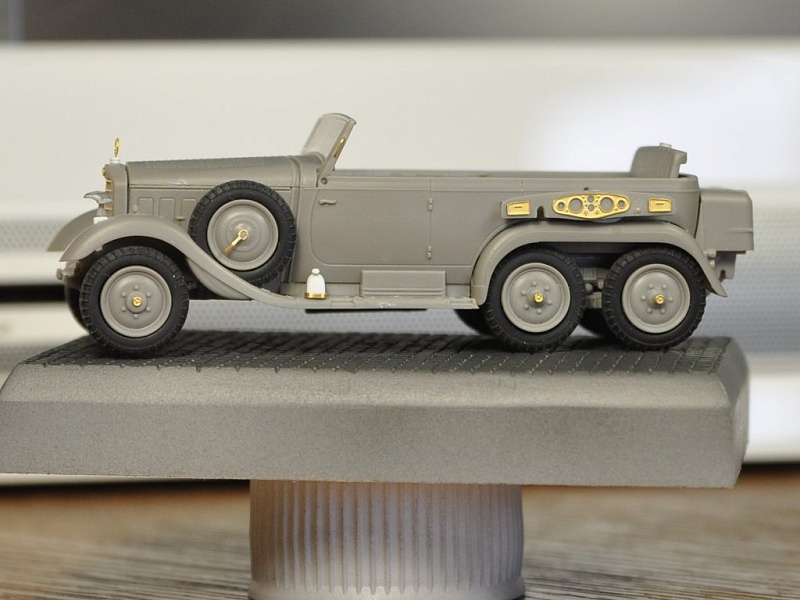 | Приветствую коллег по хобби! Собрал геровоз от ICM. Для модели разработал травление, из основного капотная эмблема, руль (китовый ни куда не годится) и эмблемы на ступицы. Приборка тоже в кассу, но после посадки геров ее оказалось не разглядеть. Заменил ручки-скобы на проволочные, все фары (кроме головного света) поменяны на эльф. Окрас кузова глянцевым черным ревеллом, хром - суперметаллик от Ганзе и Алклад. Пулеметы MG34 от Миниворлд с небольшой конверсией. |