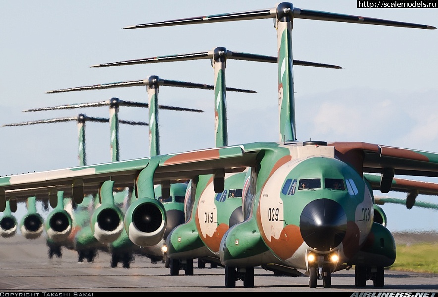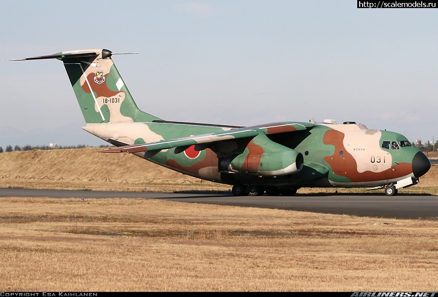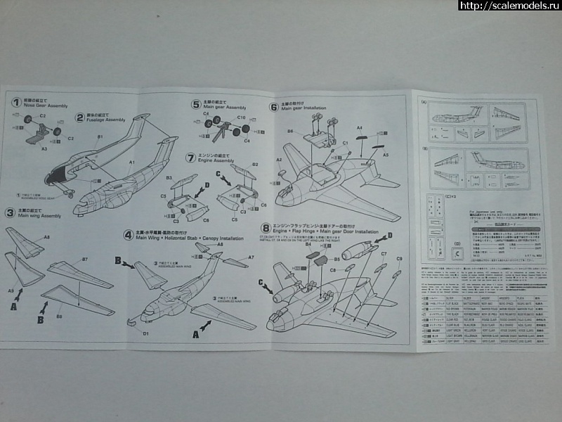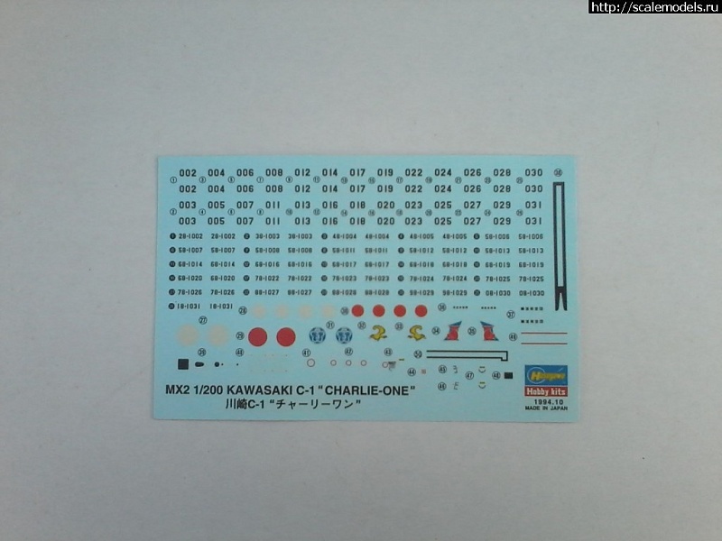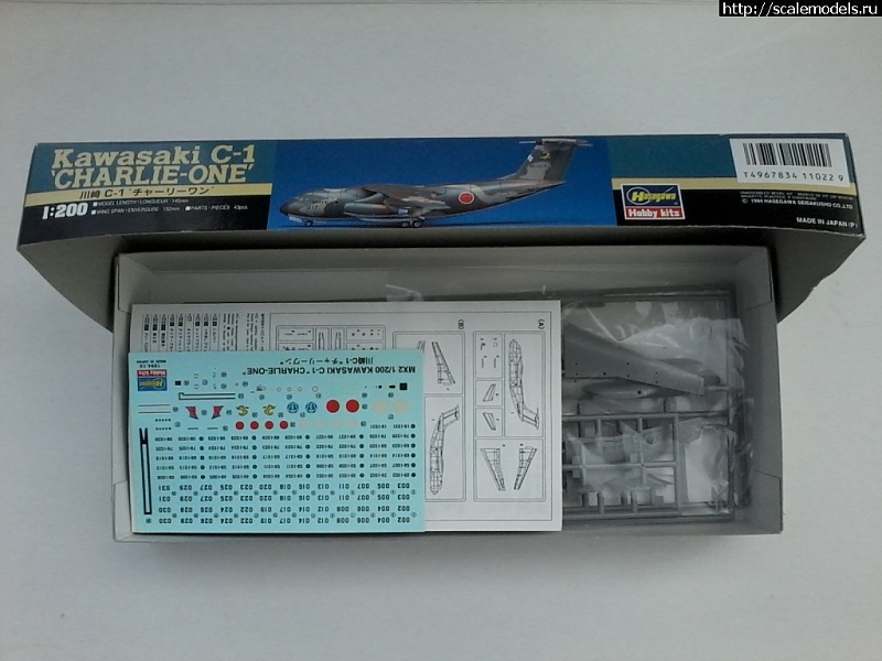 | Приветствую ! Японская фирма Хасегава довольно давно выпускает модель самолёта Каwasaki C-1 в двухсотом масштабе (1:200). Представляю обзор этой модели.-------- ИСТОРИЯ. На вооружении воздушных сил самообороны Японии состояли устаревшие американские машины С-46 .Первый полёт такого самолёта был осуществлён ещё в 1940м году. Для их замены японцы решили создать свой собственный самолёт, правда создать двигатель для них было слишком сложной задачей. Поэтому японцы взяли двигатели американской разработки Пратт-Уитни,и стали выпускать их по лицензии. А вот сам самолёт им создать удалось. Законодательство Японии запрещало разработку самолётов с большим радиусом действия, поэтому дальность машины оказалась небольшой. Самолёт оказался весьма удачным. Он развивал скорость в 807 км/ч,мог брать на борт 60 солдат или 45 парашютистов-десантников. Или 8 тонн груза. Экипаж состоял из 5 человек. При необходимости в самолёт можно было загрузить 36 лежачих раненых с сопровождающими. Самолёт имел длину 29 метров, размах 30,6 метра ,и высоту около 10 метров. Пустая машина весит 23220кг, а полностью снаряжённая 38700кг. Первый полет осуществили 12 ноября 1970года. Выпускали С-1 с 1970 по 1979 год. Эксплуатация началась с 1974 года. Дальность полёта с полной загрузкой 1300км ,а перегоночная 3353 км. Выпустили 31 экземпляр. --------КОРОБКА. Коробка с красивым рисованным боксартом(не фото и не компьютерная графика!) сделана из твёрдого картона. Она открывается вверх. Сбоку расположена фотография готовой модели. Содержимое упаковано в целлофановый пакет. Размеры коробки небольшие. Формат нестандартный, она вытянута в длину. При пересылке коробка потребует дополнительное усиление.--------ИНСТРУКЦИЯ. Инструкция чёрно-белая, содержит всё необходимое: описание прототипа ,схемы расположения деталей,схемы сборки,окраски и расположения декалей. А также советы по сборке моделей,переведения декалей и предостережения,типа обязательного проветривания помещения. Чёрно-белая схема окраски в 1994 году была не особо понятна. Но сегодня, при наличии интернета с фотографиями прототипа, она не создаёт проблем. В наборе предложено несколько вариантов, причём как на серебристую окраску,так и на камуфляжную. Проверка на соответствие прототипам показала,что не на все варианты есть эмблемы (они наносятся на киль).Так что прежде чем выбирать вариант,следует найти фото именно того борта. ---------ДЕКАЛЬ. Отпечатана в 1994 году. На голубой декальной бумаге. Декаль имеет технические надписи. Но их немного. Белый цвет не чистый,а с кремовым оттенком. Так что подложку под кокарды надо делать с помощью масок, предварительно задув белой краской. ----------ОСТЕКЛЕНИЕ. Остекление дано одной деталью,а именно лобовым стеклом кабины пилотов. Больше никаких прозрачных деталей нет. Ни иллюминаторов, ни фар, ни аэронавигационных огней .Так что кое-какие детали придётся делать самостоятельно. ---------ПЛАСТИК. Пластик производит хорошее впечатление. Он твёрдый, характерный для моделей этой японской фирмы. Модель разработана уже по новой технологии, то есть с внутренней расшивкой (другие модели Хасегава в 200м масштабе разработки 80х годов прошлого века имели внешний крой). Расшивка тонкая, аккуратная. В набор входят 4 литниковые рамки из твёрдого пластика серого цвета. Технология ЛВД (литьё под высоким давлением). Детали аккуратные, изящные. Традиц