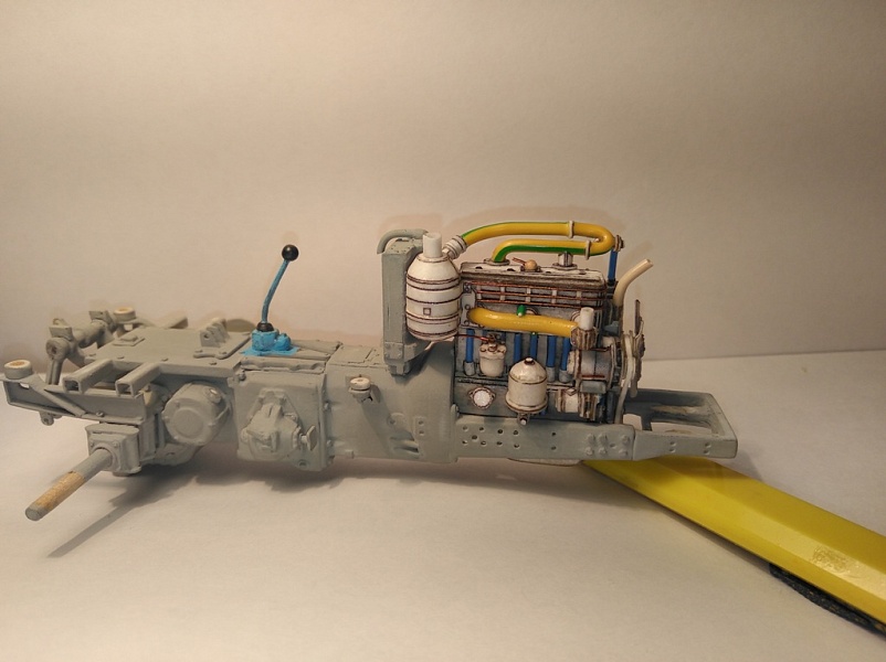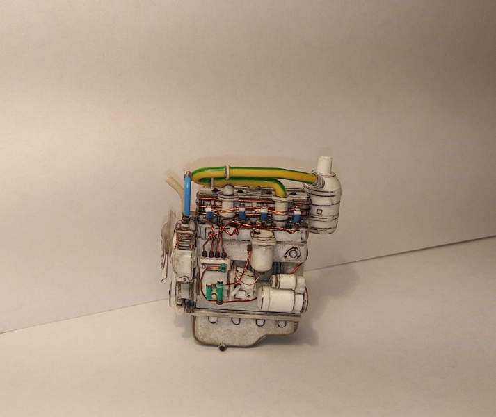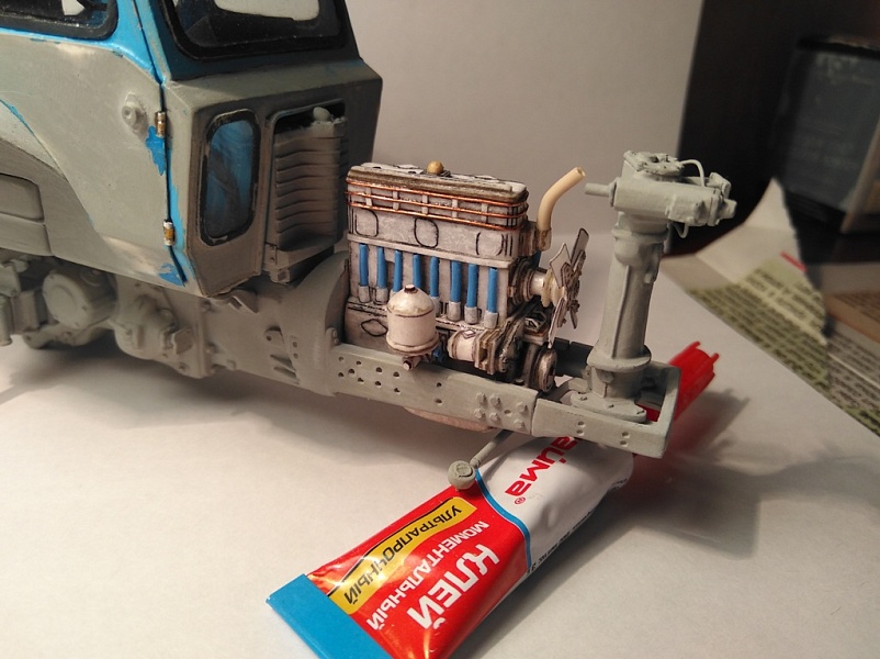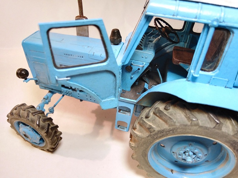 | Модель изготавливалась в масштабе 1:25 по выкройкам от « Modeller» мтз-50, с доработками, двигатель и капот собственной разработки. При работе использовал: бумага офиска 80 , ватман 200 гр, картон разной толщины, клей Момент столяр, цианокрилат. Грунтовал серым грунтом из балончика, окраска аэрографом акрилом Tamiyа, смывка акрил на фейри. Пачкал пастельными мелками. | |