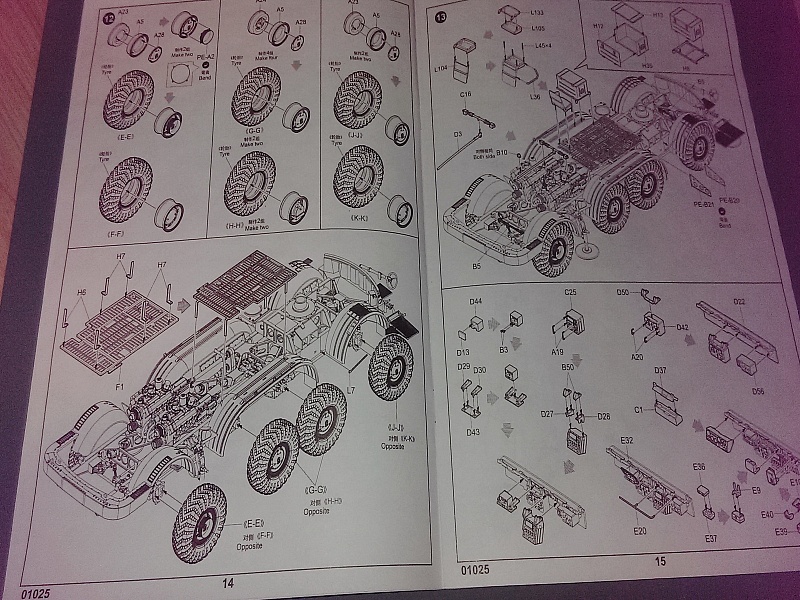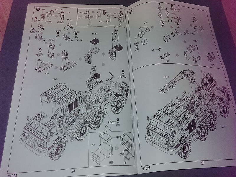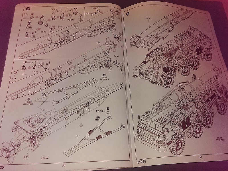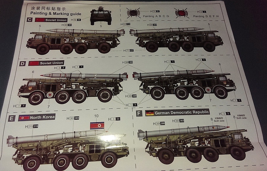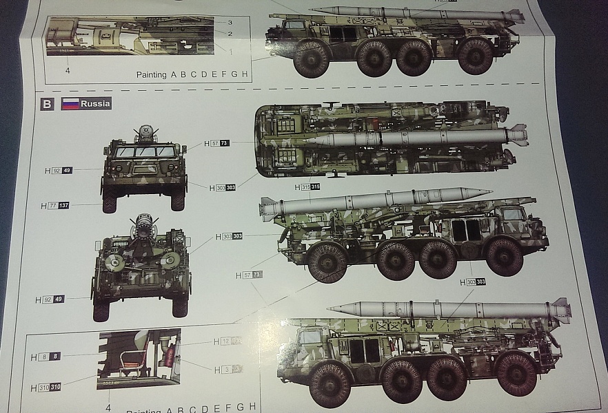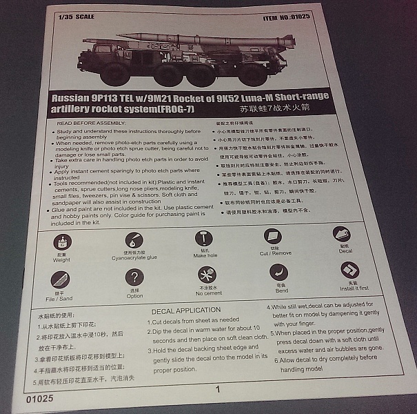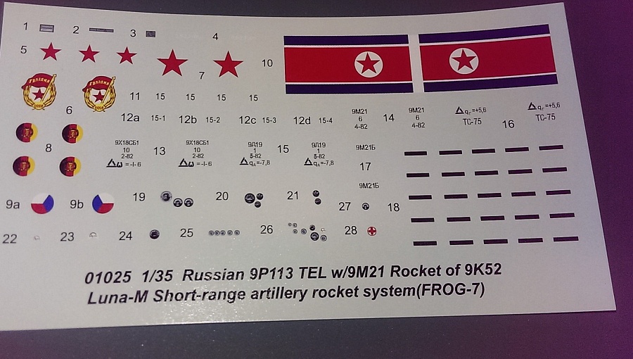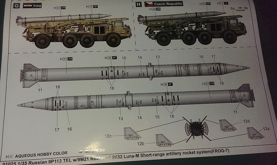| Всем привет! Сегодня хочу немного поведать Вам о новинке китайской фирмы Трумпетер – модели советского ракетного комплекса Луна-М, он же FROG7 по буржуинской классификации. Артикул: 01025 Сначала немного истории: В 1961 году на вооружение Советской армии был принят комплекс "Луна", в состав которого входили гусеничная пусковая установка 2П16, созданная на базе плавающего танка ПТ-76, а также ракеты 3Р10 и 3Р9 с ядерной и осколочно-фугасной боевыми частями. Еще до поступления на вооружение комплекса "Луна" по Постановлению Совета министров СССР от 17.02.1961 г. начинаются работы по разработке его модернизированного варианта с увеличенной дальностью стрельбы. Эти работы завершились созданием фактически нового тактического комплекса, получившего обозначение 9К52 "Луна-М". Для этого комплекса была создана ракета 9М21, новая пусковая установка и транспортная машина на колесном шасси ЗИЛ-135ЛМ. Первый пуск ракеты 9М21 состоялся 27 декабря 1961 года, а в серийное производство и на вооружение комплекс 9K52 "Луна-М" поступил в 1964 году. Серийное производство велось на заводе "Баррикады". Данный комплекс стал самым массовым в Советской армии, пик развертывания боевых машин комплекса пришелся на 1986г., когда их насчитывалось в войсках порядка 750 штук. Разработанный в 1968г. вариант комплекса 9К52ТС, предназначенный для стрельбы ракетами с фугасной боевой частью, широко поставлялся на экспорт. Его покупателями стали армии примерно 15 стран, включая вооруженные силы государств Варшавского договора, Кубы, Египета, Ирака, Кувейта, КНДР. Боевой дебют комплекса состоялся в ходе арабо-израильской войны 1973г. Комплекс "Луна-М" применялся в ряде региональных конфликтов, в том числе, в Афганистане, ирано-иракской войне 1980-88гг., войне в Заливе 1991г. Теперь заглянем в коробку и посмотрим сам набор Коробка не маленькая, но и не сказать, чтобы очень большая. В ней компактно поместились 15 литников с детальками из привычного светло-серого пластика и отдельные крупные детали кабины и корпуса силового отделения. Прозрачные детали остекления кабины и фар также представлены. Дополнительно набор включает в себя 3 небольшие платы с фототравлеными деталями. В общей сложности около тысячи деталей. Литье весьма достойное, все детали пролиты хорошо, облоя и дефектов не видно. Шины колес из резиноподобного материала, сделаны неплохо, но шов таки небольшой есть. Огорчило, что вместо тросса Трумпетер жадничает и дает нам нелепую веревочку, судьба которой закончится в мусорном ведре. Базовое шасси ЗИЛ-135ЛМ знаменитое своей силовой частью из двух движков по 180 л.с. хорошо выполнено в пластике. Ажурные тоненькие детали стенок и балок рамы заботливо упакованы в защитный мягкий материал, чтобы ненароком не сломались от соприкосновения с другими литниками. Насколько двигатели и трансмиссия похожи сами на себя судить не берусь… однако, зная производителя, подозреваю наверняка есть косяки в мат части. Но со сходимостью уверен, проблем не будет. Порадовало отсутствие следов от толкателей на многих деталях. Например, на внутренних поверхностях колесных ниш и крыльев. Инструкция по сборке традиционно выполнена в виде книжки и состоит из 30 этапов. Схема окраски и маркировки предлагает 8 различных вариантов на машины СССР\России, а также стран, куда производились экспортные поставки данного комплекса. Цвета 