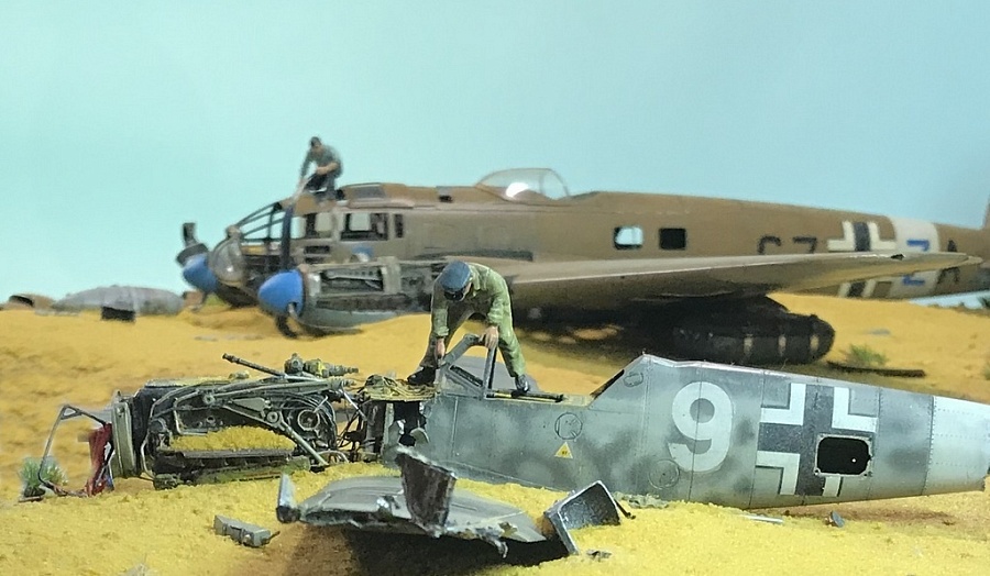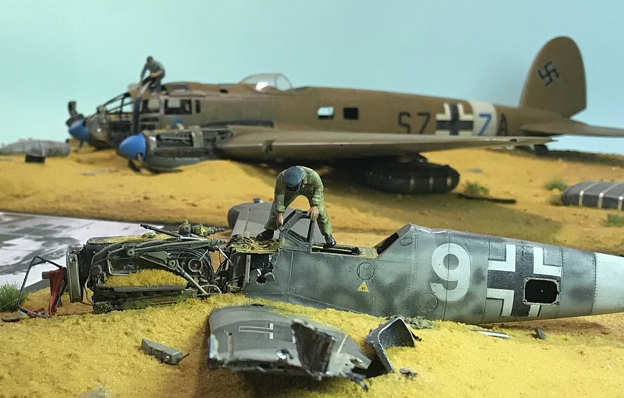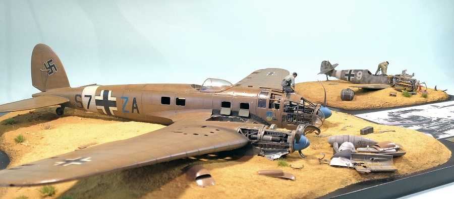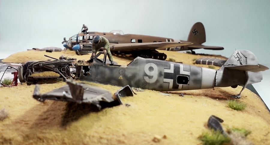 | Всех приветствую!Представляю модельному сообществу фотографии моей очередной диорамы. Стройка продолжалась на протяжении всего 2018 года с небольшими перерывами. За основу были взяты фотографии, сделанные в Египте в 1942 году. В качестве доноров для этого "металлолома" послужили модели Не-111 Н-3 от фирмы "ИСМ" и Bf.109 F-2 от фирмы "Звезда". Обе модели уже хорошо известны, отличного качества и поэтому в отдельном представлении не нуждаются. Сильно загружать информацией по строительству диорамы не буду. Тем кому это интересно могут посмотреть весь этот процесс здесь: : http://scalemodels.ru/articles/12831-He-111H-5-i-Bf-109F---na-zadvorkakh-bolshojj-vojjny.htmlТем кому интересен конечный результат - приглашаю к просмотру! Сама работа над этой композицией, как ни странно, дала мне много положительных эмоций и удовольствия. Просто бывает часто так, что начинаешь делать модель, потом перегораешь, стройка переходит в долгострой и потом уже приходится заставлять себя её закончить. Здесь было все на одном дыхании и порыве. Как любовь с первого взгляда! Видимо перегореть не успел))))).Всем спасибо за внимание! |