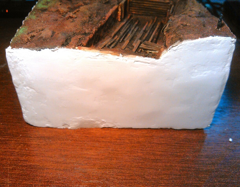 С торцами вообще самая заморочь - они кривые и шпат(к?)левка вечно норовила отвалиться (не помню, видно ли, там такое ощутимое местечко есть, обвалилось как побелка в поликлинике). Я сделал глупость - сначала саму виньетку, а потом уже бытовуху типа рамки (которую в итоге пришлось пилить под форму кубика пеноплекса) и торцов (которые надо было банально залить в опалубку, поставленную на рамку, а не выводить шпателем, и покрасить ДО того как начинать делать что-то сверху). Плюс использовать тонкий пенополистирол а не пятисантиметровую дуру, потому что выгрызать в нем дно окопа одна морока (его же потом еще и обратно выровнять надо), проще было бы надставить из нескольких слоев.