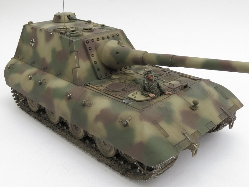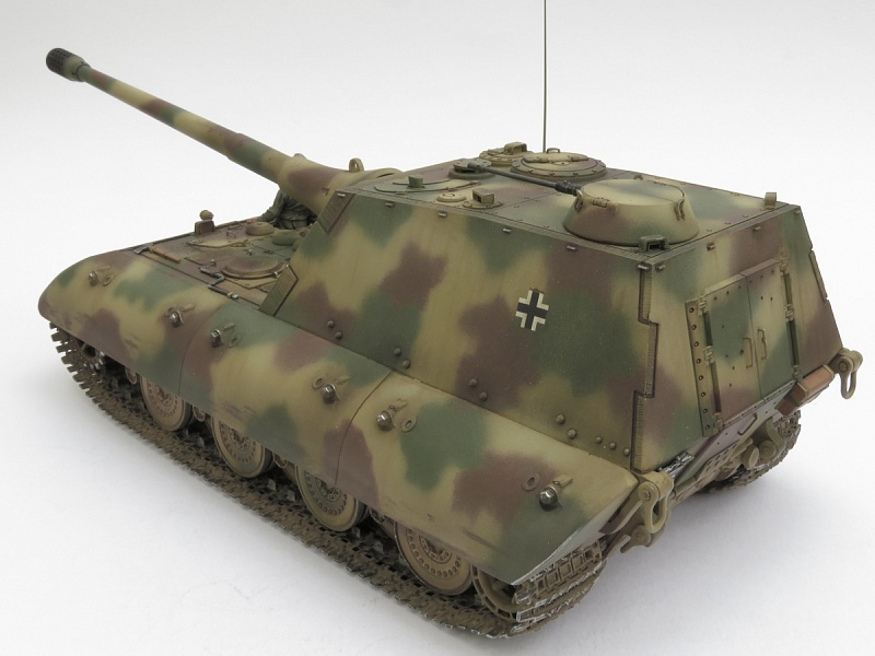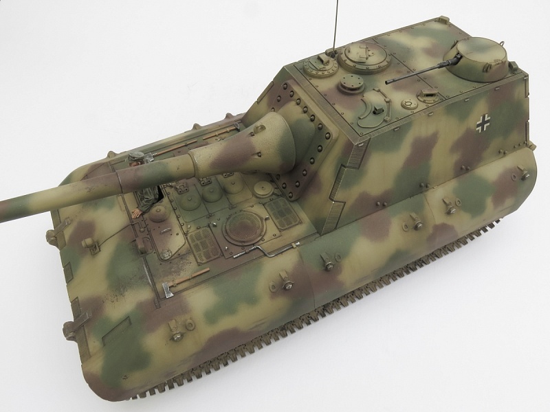 Главное впечатление от модели - ну какая же она большая! Я, конечно, знал, что эта ПТ большая, но увидеть воочию, как оказалось, - совсем другое дело))) В сборке модель несложная, деталей немного, собирается легко. Литье не на 5 баллов, конечно, но вполне приемлемое. Утяжин на модели практически не было. Траки в коробке идут наборные, собираются на щелчках, проблем с ними не возникло. Шанцевый инструмент в наборе есть, но в инструкции не указан. Собрал как есть, только заменил KwK на Flak от Adlers Nest и поставил антенну от тех же японцев. Оптика в наборе дается непрозрачной. Красил Тамией, дальше - химия от АК Interactive и грязь от Wilder. Радист - "Танк". |