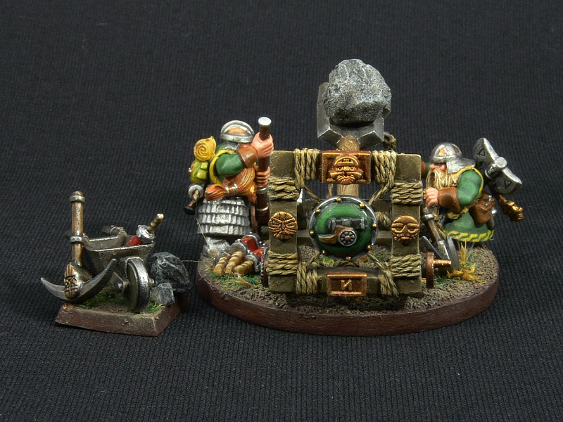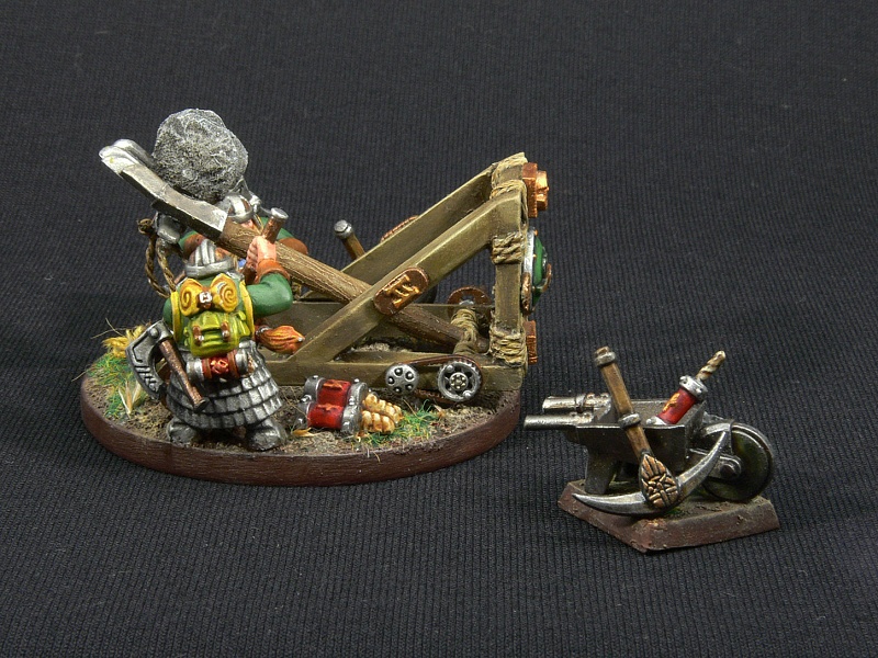 Несколько раз перекрашивал деревянные конструкции - не нравились. Потом, как уже писал, устанавливая гномов, не понравились их позы - переделывал и соответственно менял конструкцию машины. Хотелось детализировать композицию, чтобы ее было интереснее рассматривать: у гномов есть инструмент и оружие. Всякие такие мелочи затягивали модель. Другими словами, сроки изготовления зависят от степени детализации и дотошности вашего отношения к модели )))