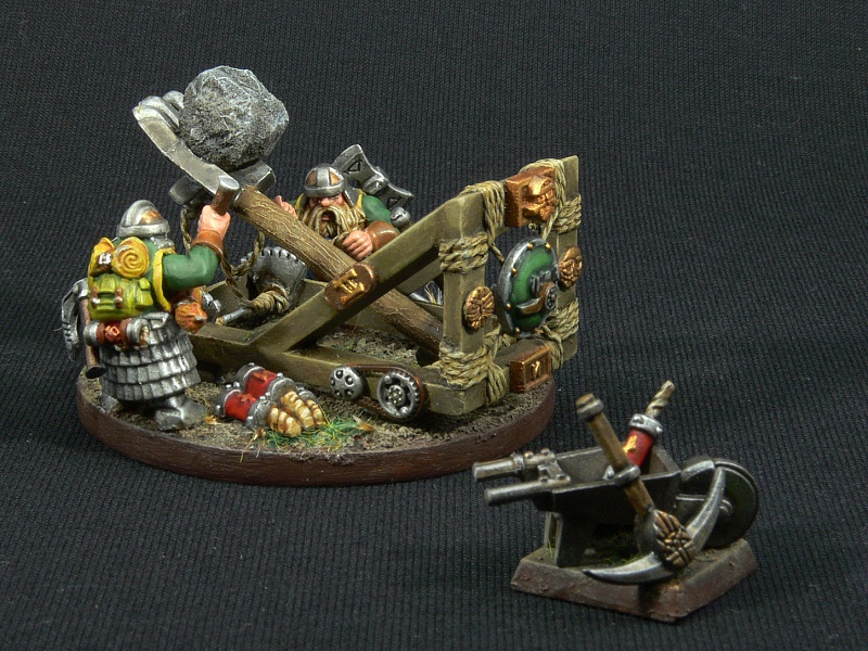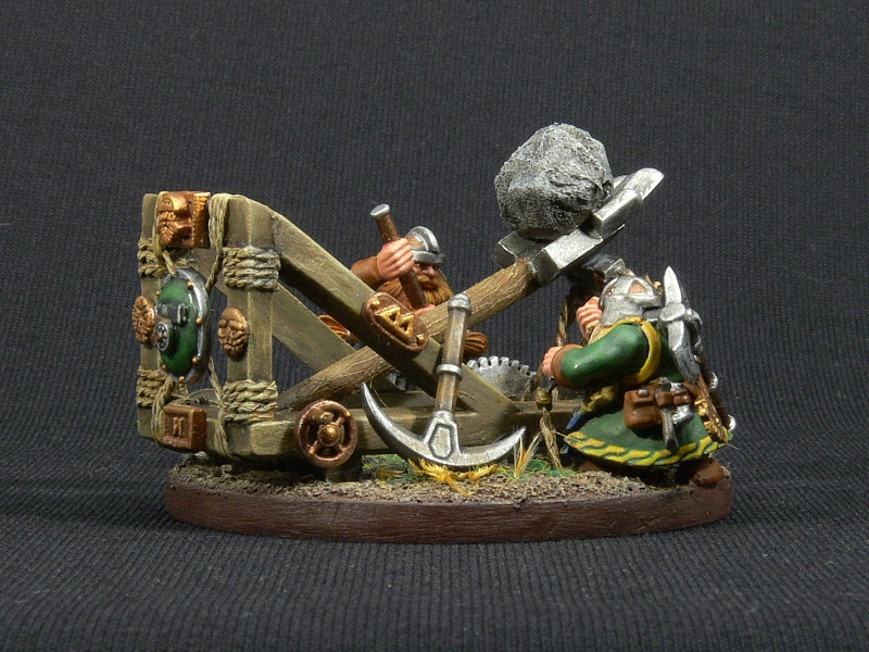 Отлично покрашено. Только конструкция катапульты, с точки зрения физики, неудачна. Удал о перекладину создаст очень сильный опрокидывающий момент. Точка вращения (балка основания, переднее колесо) должна быть дальше вынесена вперед.