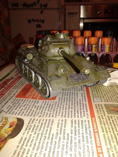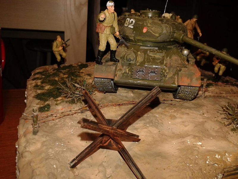 | Т-34-85 - Звезда; пехота, ежи, бочка, канистры, кусок стены - Tamiya. Окрашено красками Звезда. Бруствер - остатки латников, калючка - проволока (сам крутил), кусты - дешёвый декор+имитация травы. Основа: фанера, монтажная пена, гипс; окрашено гуашью. Края после заделал, но сфотографировать уже не могу, диорама передана в музей "История танка Т-34" |