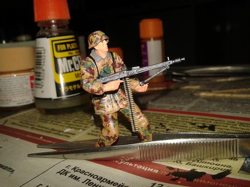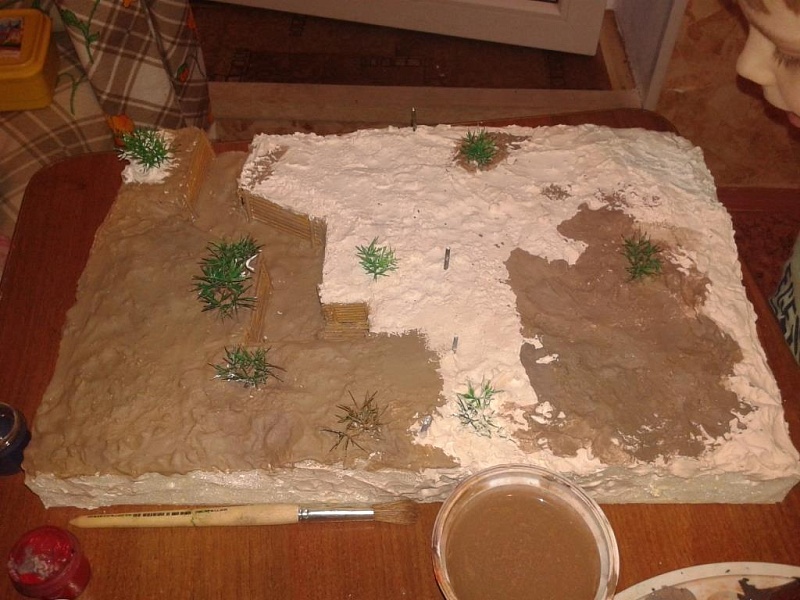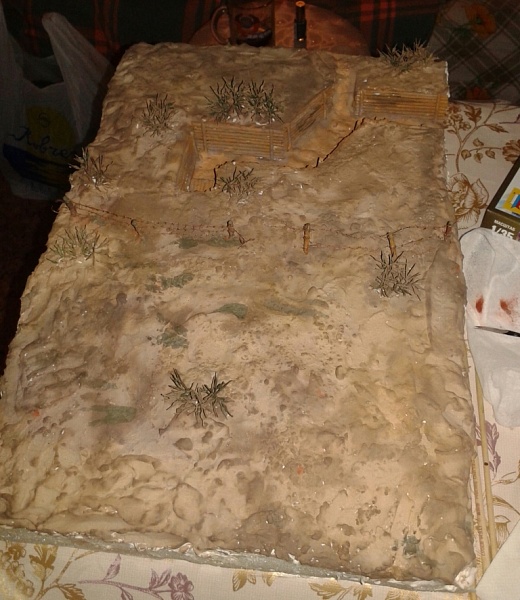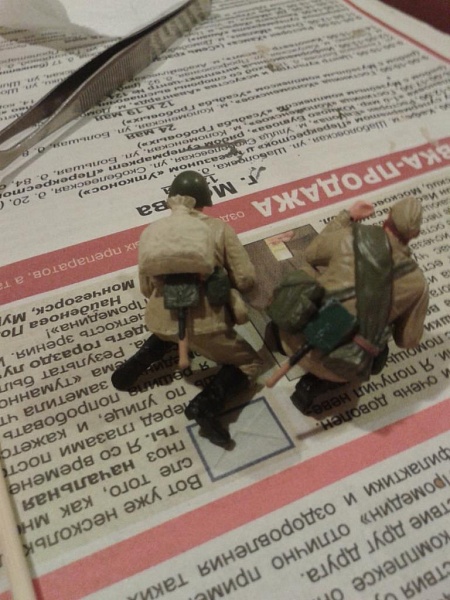 Меня два момента удивляют - как ни крути, а сил много положили, основание большое, фигурок много, колючая проволока, кусты, вот это вот все - можно было бы ведь ватман на фон поставить, чтоб без газет, нескафе и диванов. И второе - как это люди с места в карьер решаются двадцать фигурок зараз делать.