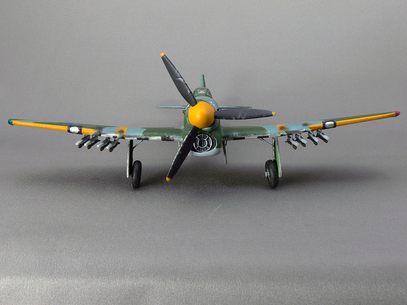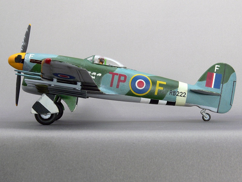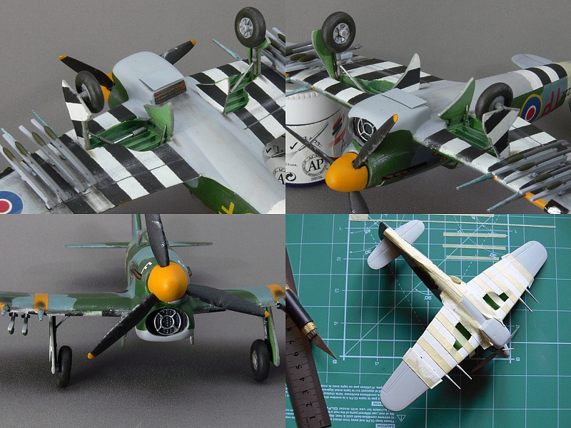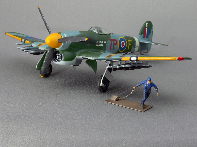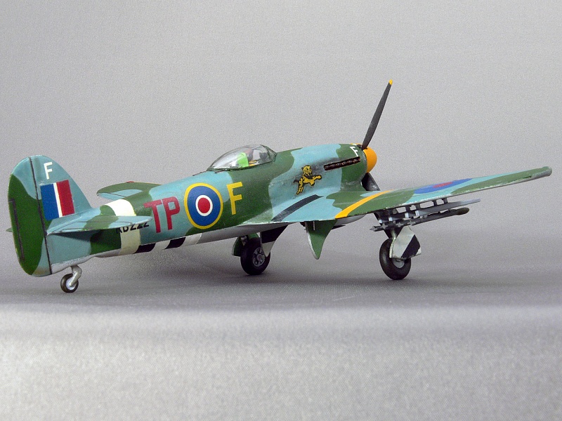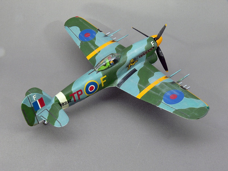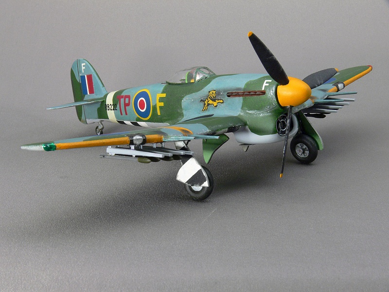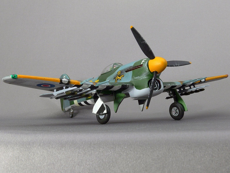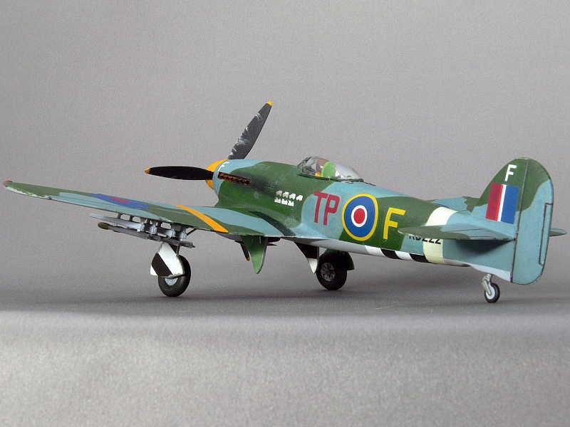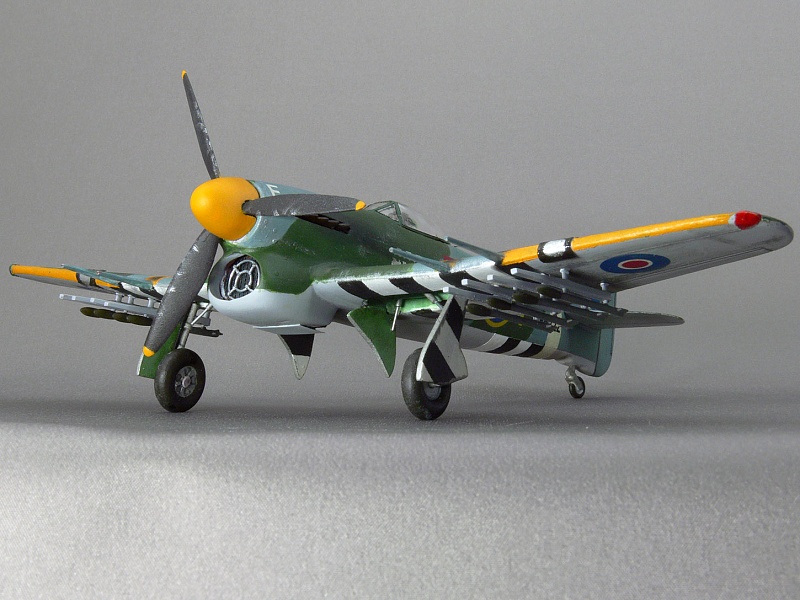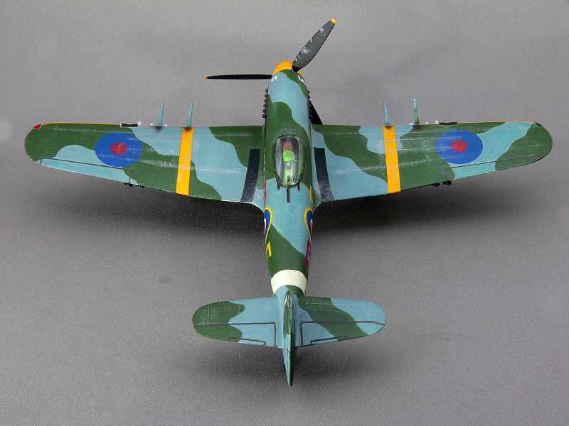| Добрый день! Хочу представить еще одну свою модель самолета. Делал ее уже давно. Собрал модель бОльшую часть (3/4) сам. Кабину я не трогал. Красил я, но папа поправлял. Отец нарисовал границы карандашом и сказал каким цветом красить, так я и сделал. Но все полосы вторжения делал папа, а также остальные полосы. Приятного просмотра! P.S. от папы: Пожалуй, одна из самых простых моделей. Наверное, не будет преувеличением сказать, что в ней NOVO превзошел сам себя ;) Руль высоты дан одной деталью, которую необходимо вставить сквозь намазанное клеем отверстие в фюзеляже. Кокпит пустой, ниши шасси отсутствуют (или, правильнее сказать, даны в закрытом положении :)) Начну с того, что сынишке тогда было лет десять и я подбирал несложную модель: чтобы и не жалко было испортить, и охоту не отбить. Нашлась у меня такая в загашниках в советской упаковке и с той еще декалью. Ребенку захотелось, чтобы в нем сидел пилот, что, имея множество старых моделей и их обломков, сделать было не сложно. Решил немного "облагородить" кабину: установил прицел, маячок за бронеспинкой пилота, направляющие фонаря. Помимо этого, захотелось вырезать ниши шасси и сделать их немного похожими на настоящими. Сразу скажу, что тогда не был знаком со многими технологиями моделистов и многое делал по наитию. Понимаю, что несколько не так нужно было их сделать. Также добавил гидравлику на стойки шасси и щитки из проволоки, тормозные "шланги". Сами шасси сделал, как в инструкции: прижег ось, чтобы колеса крутились, поэтому развал-схождение несколько "гуляет". В носовой части фюзеляжа установил сетку фильтра (ничего умнее не придумал - сетка от старого кинескопа). Понял, что без трубки охлаждения масло-радиатора Тайфун теряет свой неповторимый вид - склеил ее из проволоки. Для изготовления АНО тоже придумывал технологию (правда больше так не делаю): приклеил на уголки крыльев тонкую фольгу от конфет и вскрыл прозрачными зеленым и красным лаком - лак на фольге смотрится еще куда ни шло, но по краям образовывается "ступенька". Про отсутствие посадочных прожекторов понял уже в самом конце: наклеил поверх крыла прямоугольник из фольги, сверху него по центру маску в форме круга, закрасил это черным. Когда маску снял в центре остался блестящий круг - потом вскрыл это все прозрачным глянцевым лаком. Знаю, что все это кустарщина, но для игрушки получилось хоть что-то. Фонарь кабины родной, выкупанный в Футуре. Загрунтовали тамиевским светло-серым грунтом и оставили его снизу незакрашенным. Камуфляж наносили кисточкой акрилом Humbrol. Сын красил основную массу, а я корректировал края. Серебряной краской методом сухой кисти пытался имитировать потертости, царапины и сколы - получилось не очень :(. Для полос вторжения делал маску из обычного малярного скотча, о чем потом пожалел - он легко пропускает воду (жидкую краску). Теперь пользуемся тамиевским. Везде, где использовал маски получились "ступеньки" - не могу с уверенностью сказать, что сейчас уже победил эту проблему :(. Хоть были родная декаль и нововская упаковка, но решил поискать что-то другое (декаль эта ужасная - не хотелось модель портить). Успешно приобрел декаль для этой модели от "Восточного Экспресса" за считанные копейки! На ней хоть цвета и не очень соответствуют, но пленочка тонкая, ложится хорошо, отлично приваривается растворителем. Благодаря ей п