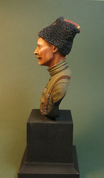 Первая попытка раскрасить бюст героя была предпринята пару месяцев назад, правда то был другой бюст - киногероя (ну или Б.Бабочкина в роли Чапаева из всем памятного фильма). Та попытка не удалась, частично из-за кривой скульптуры, частично из-за кривых рук, увы. Даже выложил сюда, но через час убрал - стыдно такое показывать. Пришлось срочно искать замену. Купил и покрасил довольно быстро. Отливка была не лучшего качества, странная смола, напоминающая полиэтилен, отверстия в непонятных местах, неровности на поверхности лица. Но ничего критичного, желание покрасить именно Василия Ивановича, да еще реального, не киношного оказалось сильнее природной лени и разгильдяйства. Результат налицо. Темпера, масло. Приятного просмотра! |