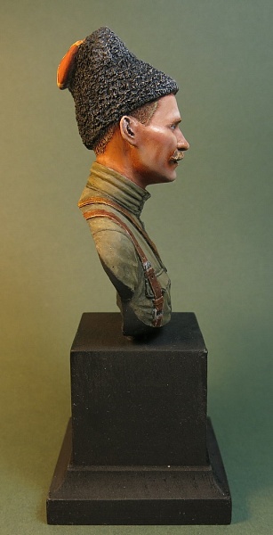 Следующий бюст, на этот раз 1/6, производства российской компании AGES. Василий Иванович Чапаев, герой Гражданской войны, человек-легенда, персонаж сотен книг и анекдотов. Биографию комдива можно без труда найти в сети, это путь русского крестьянина, честного солдата и уважаемого, авторитетного командира, люди постарше наверняка читали одноименный роман Фурманова. Вот как в этом романе описана внешность Чапаева: "Обыкновенный человек, сухощавый, среднего роста, видимо, небольшой силы, с тонкими, почти женскими руками; жидкие темно-русые волосы прилипли косичками ко лбу; короткий нервный тонкий нос, тонкие брови в цепочку, тонкие губы, блестящие чистые зубы, бритый начисто подбородок, пышные фельдфебельские усы. Глаза... светло-синие, почти зеленые - быстрые, умные, немигающие. Лицо матовое, свежее, чистое, без прыщиков, без морщин." Так он выглядел, от этого я и толкнулся при покраске. У меня Василий Иванович получился задумавшийся, погруженный в себя, спокойный. Чуть добавил экспрессии надписью на подставке.