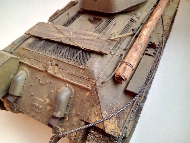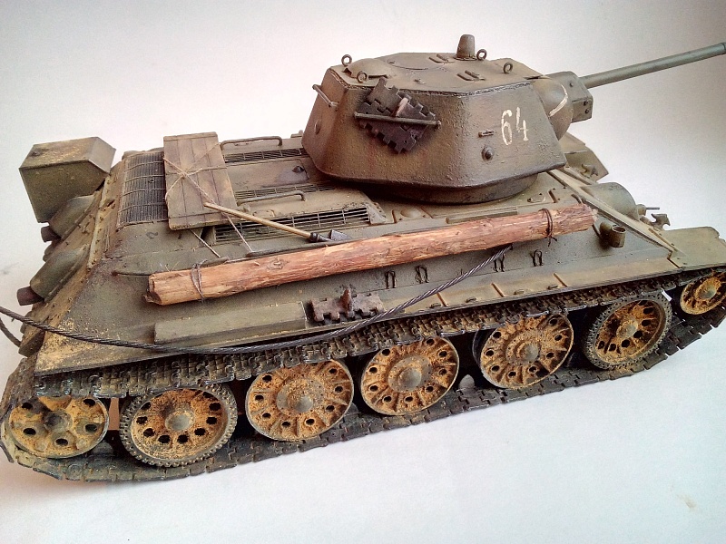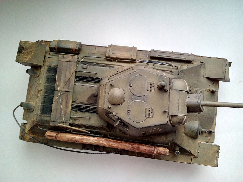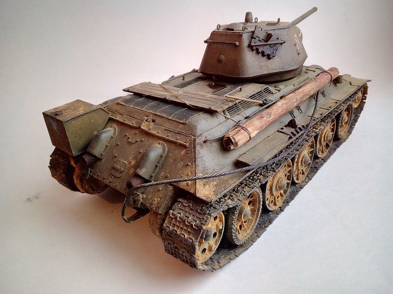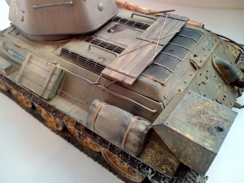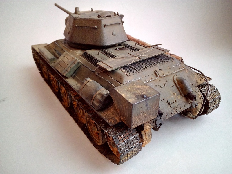 | Дело было вечером,делать было нечегоИтак,поделка похожая на 34-76.Собрана и окрашена за 4 дня. Исходник Моделист(он же Макет,Мсд,Арк,ВЭ)Башня:Добавил фактуру на гладкую как яйцо поверхность,сварные швы,ствол целиком выточил из куска литника. Корпус(даётся универсальный на все 34ки):Обточил рифлёную поверхность корпуса,срезал нос(стык ВЛД и НЛД)он острый на 34-85 обр46-го,,зашпаклевал и обточил.добавил шов.Сетки ,решётки ,петли,фототравлёные-Мир Моделей(Вояджер)трос-Микродизайн.поручни-проволока.Борт от полуторки для пехоты,скатка от ИСМ-крепится на дошипласт, Ходовка-все катки были на 34-85 поздние.Среди барахла своего нашёл ИСМовские,ведущие -Звезда,ленивцы-родные.Траки-родные,питатели-толкатели зачищены и зашпаклёваны(возможно не так хорошо как надо)дырки высверлены во всех траках(где надо).На зап.траках забыл приклеить болты крепления(уже после фото увидел,но поздно -танчик уехал) Окрас:грунт-Зип(не алё),прешейдинг-Тамия(алё),база -Зип 4БО(пойдёт),Химия-Зип,Вайлдер,лак-Ганза. | |
