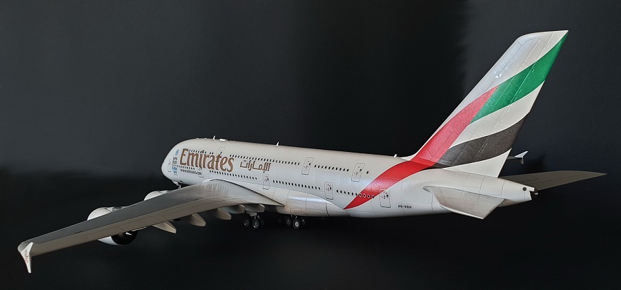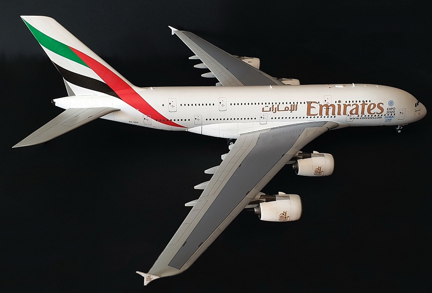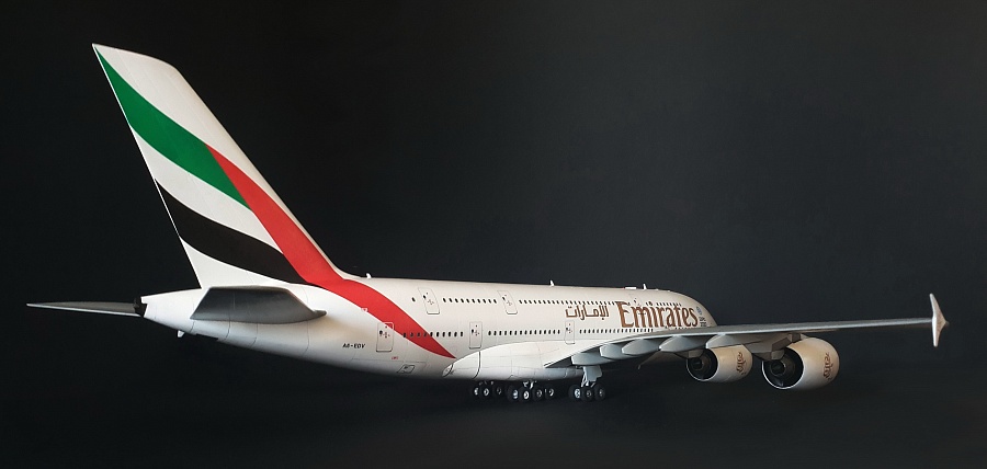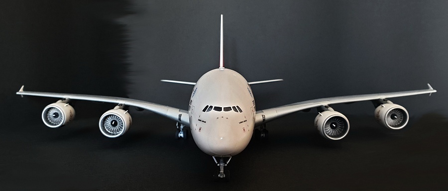 | Приветствую всех. Этот набор от известного производителя оказался в сборке для меня довольно непрост. Основная проблема - двигатели, практически полностью переделал сопла, пилоны, нарезал новую расшивку на мотогондолах. Сточил переплет с лобовика, восстановил прозрачность, маски резал сам, т.к. готовых в продаже правильных не нашел. Добавил БАНО и антенны. Изменил форму створок двуосных шасси. Зашпаклевал и заново нарезал область створок носовой стойки. Изменил форму ниш центральных стоек. Краски тамия. Декаль Аэродека плюс родная из коробки. Декаль брюха Emirates значительно меньше размером, чем необходимо как у аэродеки так и у пас, поэтому заказал отдельно у Алексея Бацких. Лак футура. Приятного просмотра. | |